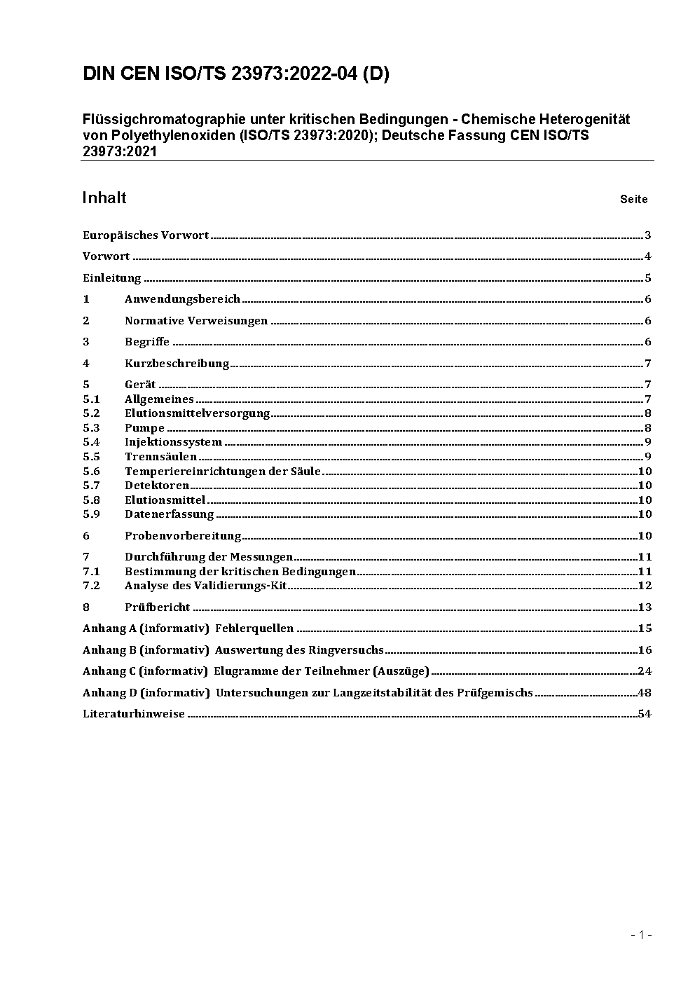 Liquid chromatography at critical conditions (LCCC) - Chemical heterogeneity of polyethylene oxides (ISO/TS 23973:2020); German version CEN ISO/TS 23973:2021