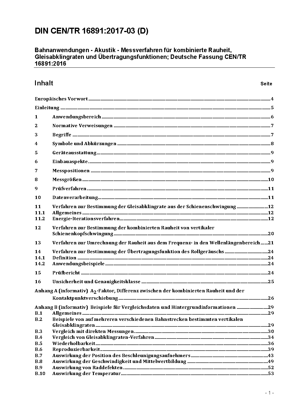 Railway applications - Acoustics - Measurement method for combined roughness, track decay rates and transfer functions; German version CEN/TR 16891:2016