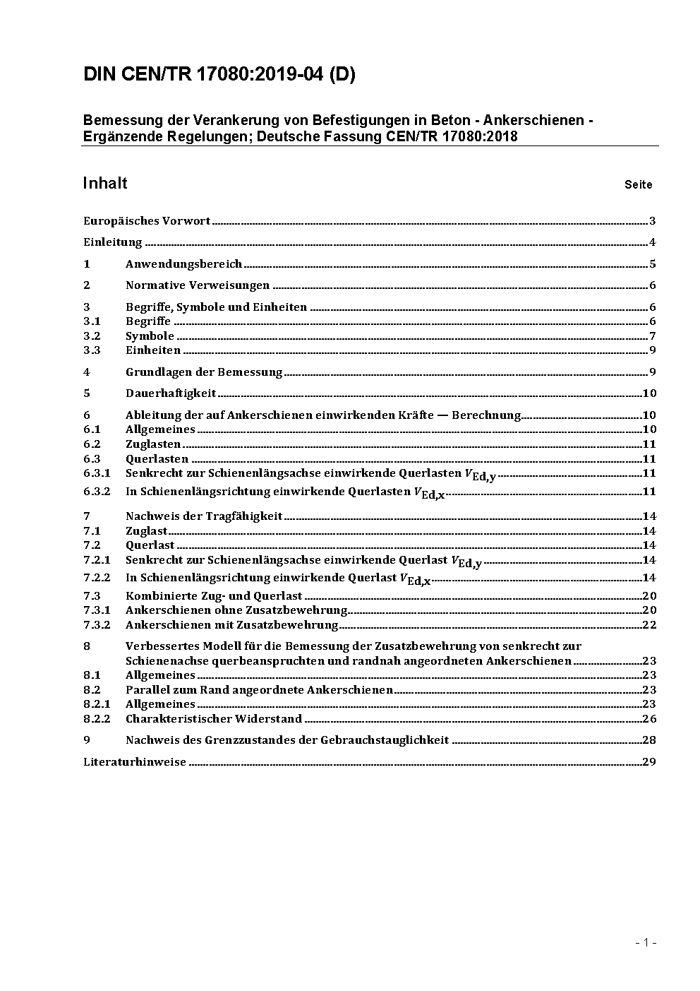 Bemessung der Verankerung von Befestigungen in Beton - Ankerschienen - Ergänzende Regelungen; Deutsche Fassung CEN/TR 17080:2018