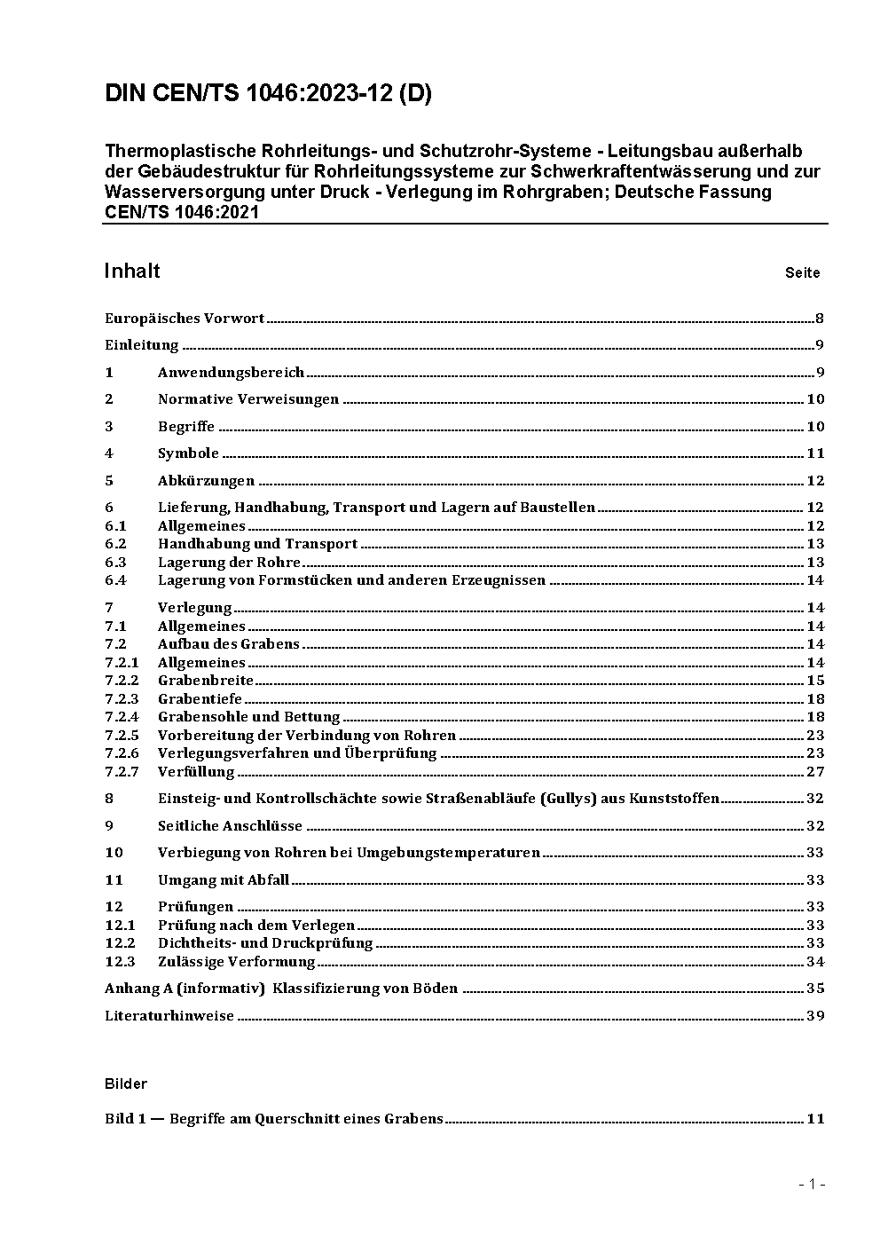 Thermoplastics piping and ducting systems - Outside the building structures for gravity and pressurised systems - Trench installation; German version CEN/TS 1046:2021