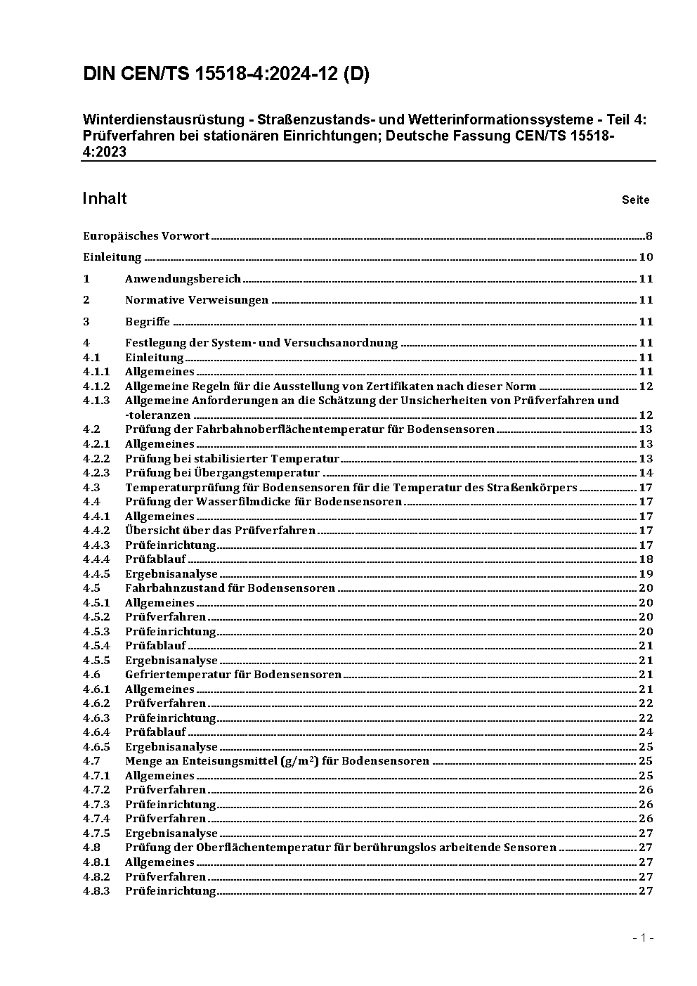 Winterdienstausrüstung - Straßenzustands- und Wetterinformationssysteme - Teil 4: Prüfverfahren bei stationären Einrichtungen; Deutsche Fassung CEN/TS 15518-4:2023