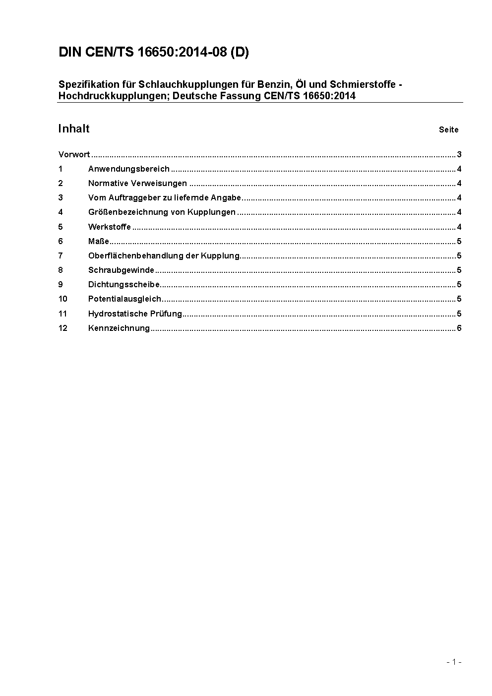 Specification for hose couplings for petrol, oil and lubricants - High pressure couplings; German version CEN/TS 16650:2014