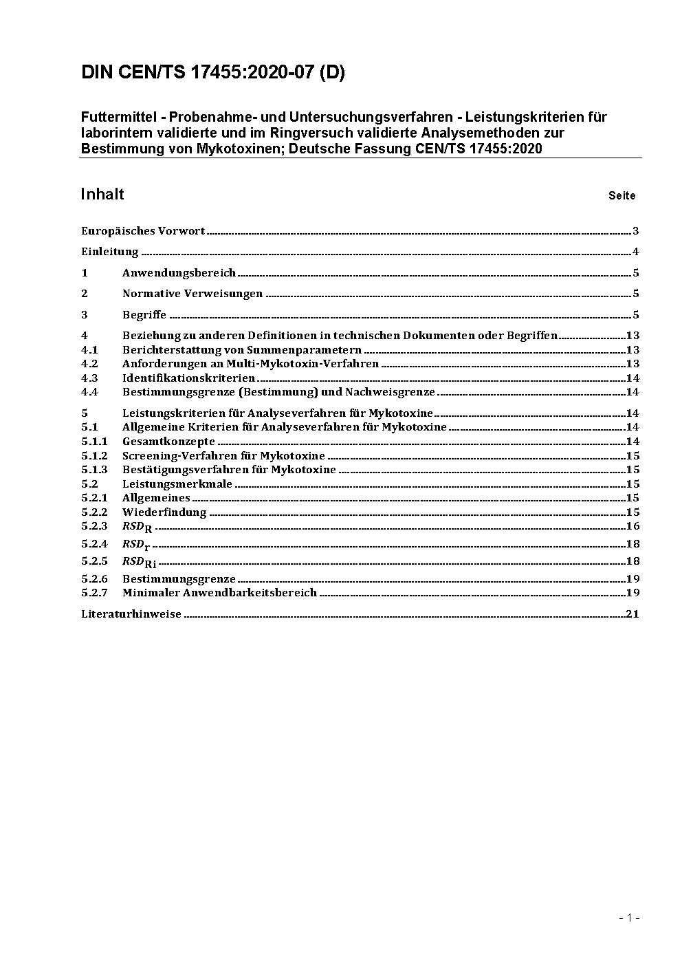 Animal feeding stuffs - Methods of sampling and analysis - Performance criteria for single laboratory validated and ring-trial validated methods of analysis for the determination of mycotoxins; German version CEN/TS 17455:2020
