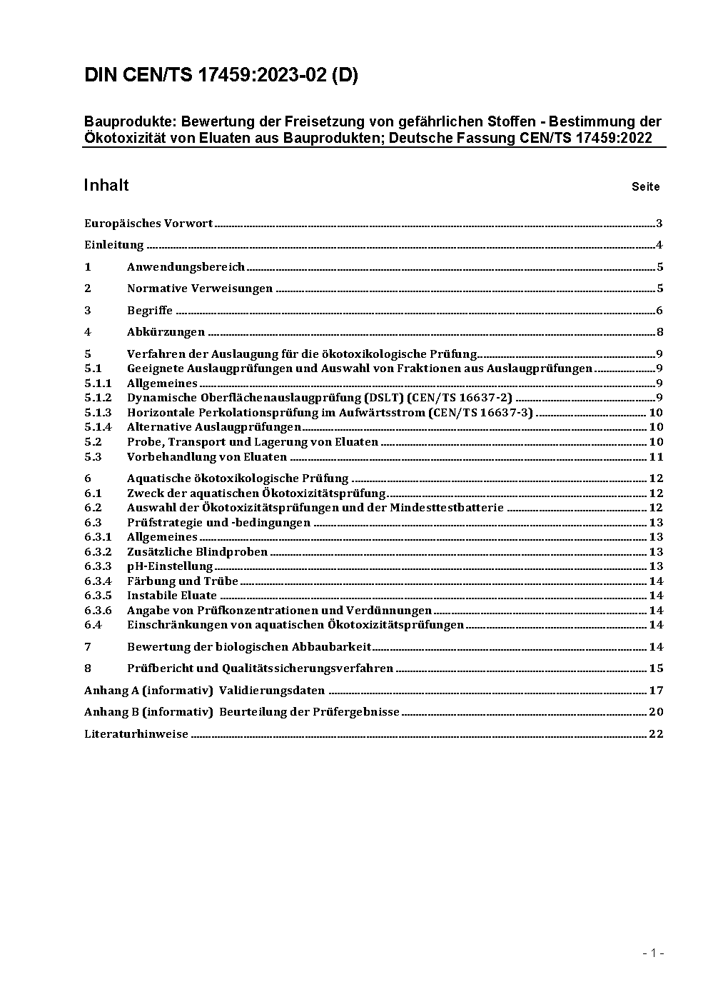Bauprodukte: Bewertung der Freisetzung von gefährlichen Stoffen - Bestimmung der Ökotoxizität von Eluaten aus Bauprodukten; Deutsche Fassung CEN/TS 17459:2022