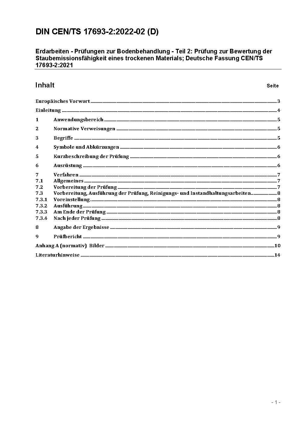 Erdarbeiten - Prüfungen zur Bodenbehandlung - Teil 2: Prüfung zur Bewertung der Staubemissionsfähigkeit eines trockenen Materials; Deutsche Fassung CEN/TS 17693-2:2021