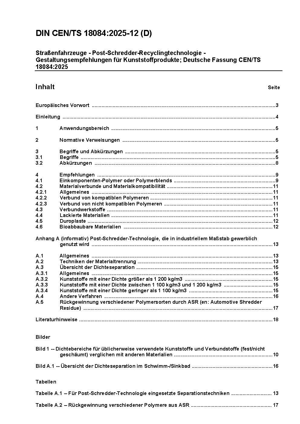 Straßenfahrzeuge - Post-Schredder-Recyclingtechnologie - Gestaltungsempfehlungen für Kunststoffprodukte; Deutsche Fassung CEN/TS 18084:2025