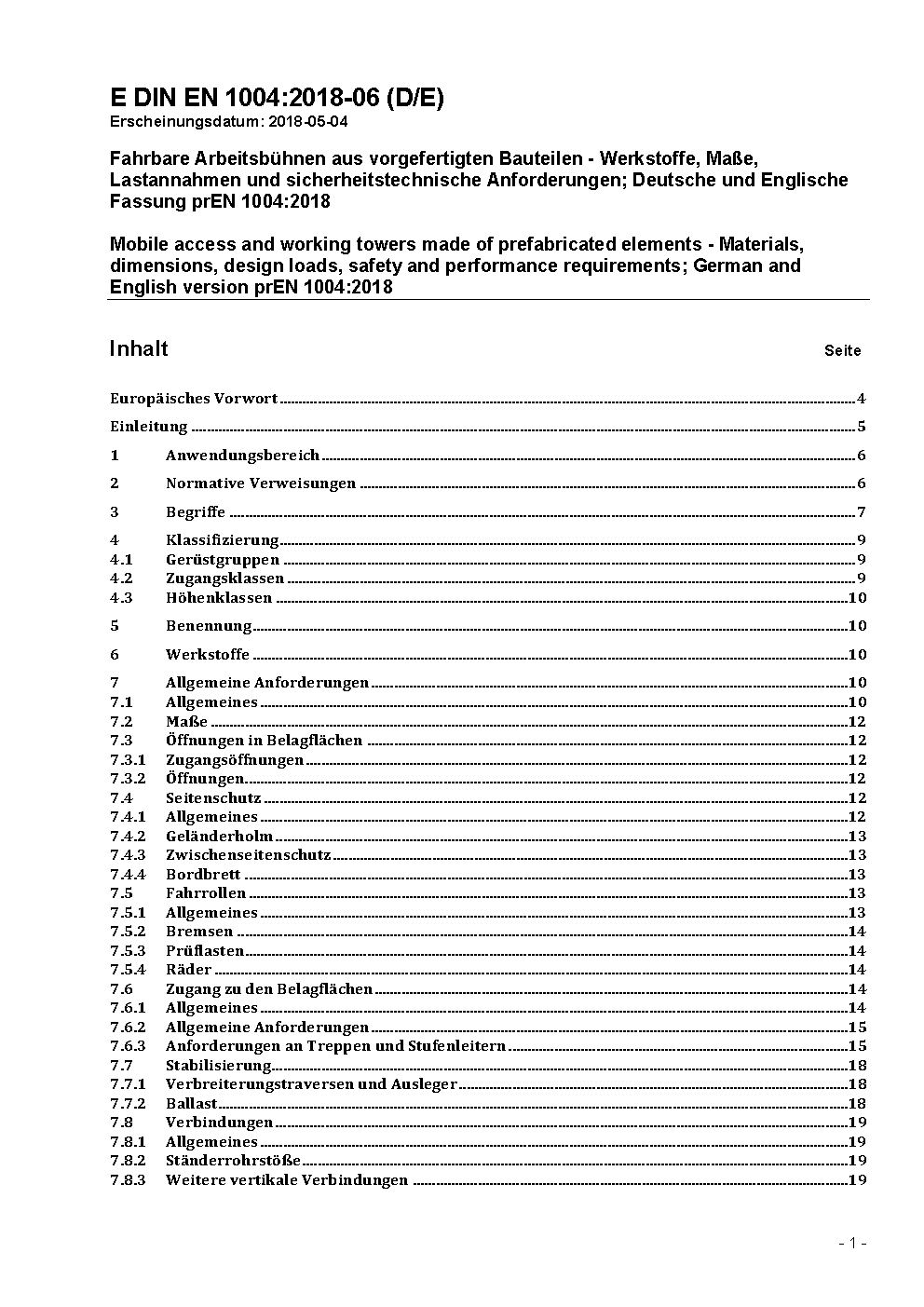 Mobile access and working towers made of prefabricated elements - Materials, dimensions, design loads, safety and performance requirements; German version EN 1004:2004