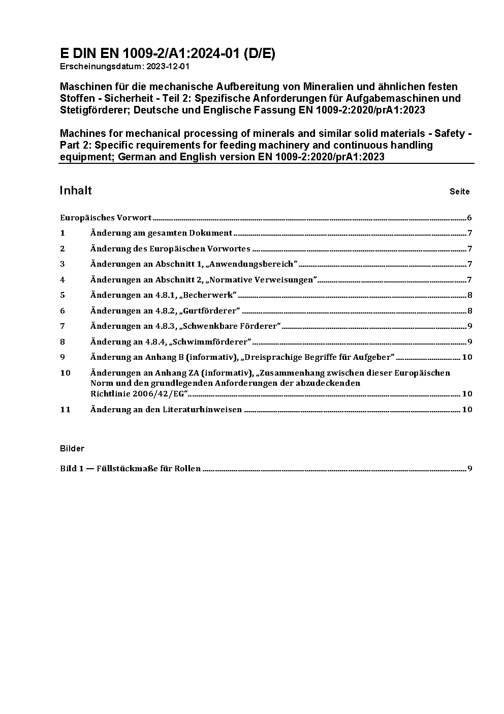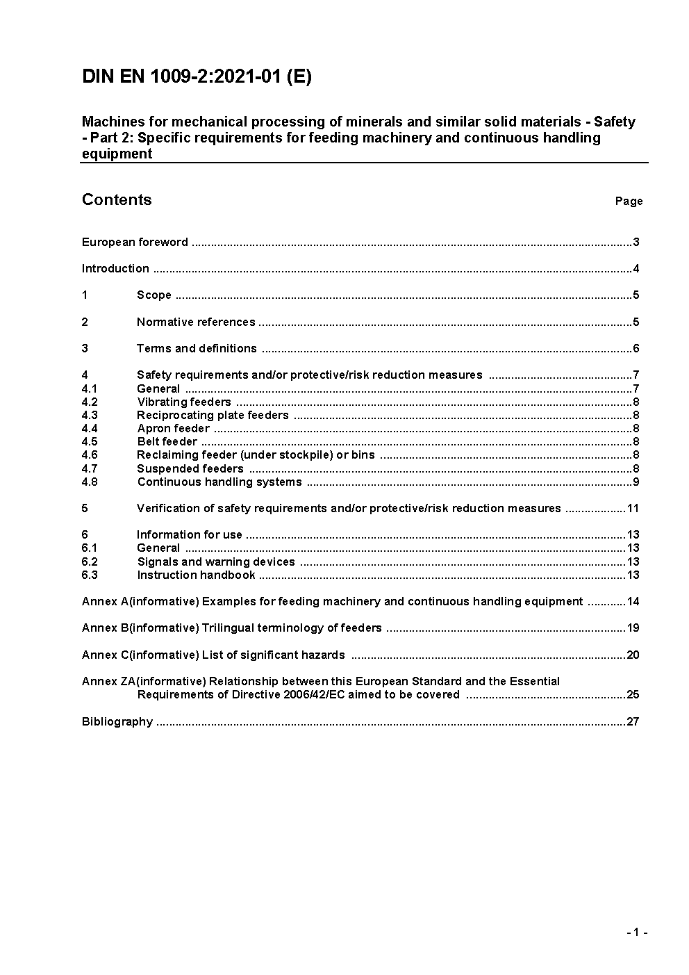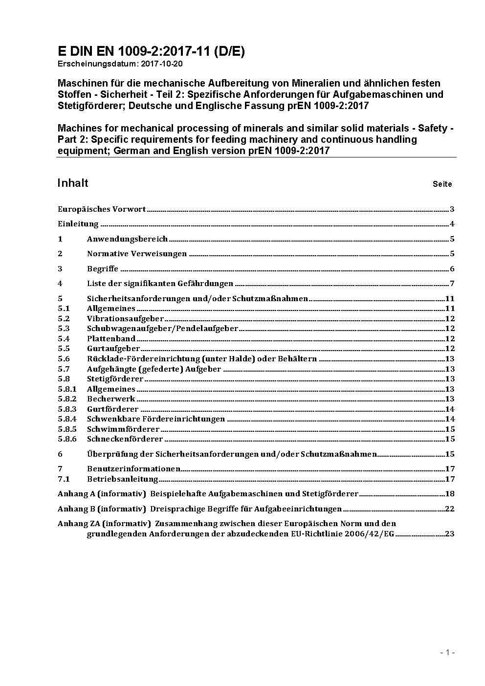 Maschinen für die mechanische Aufbereitung von Mineralien und ähnlichen festen Stoffen - Sicherheit - Teil 2: Spezifische Anforderungen für Aufgabemaschinen und Stetigförderer; Deutsche Fassung EN 1009-2:2020 / Achtung: Gilt in Verbindung mit DIN EN 1009-1 (2021-01)