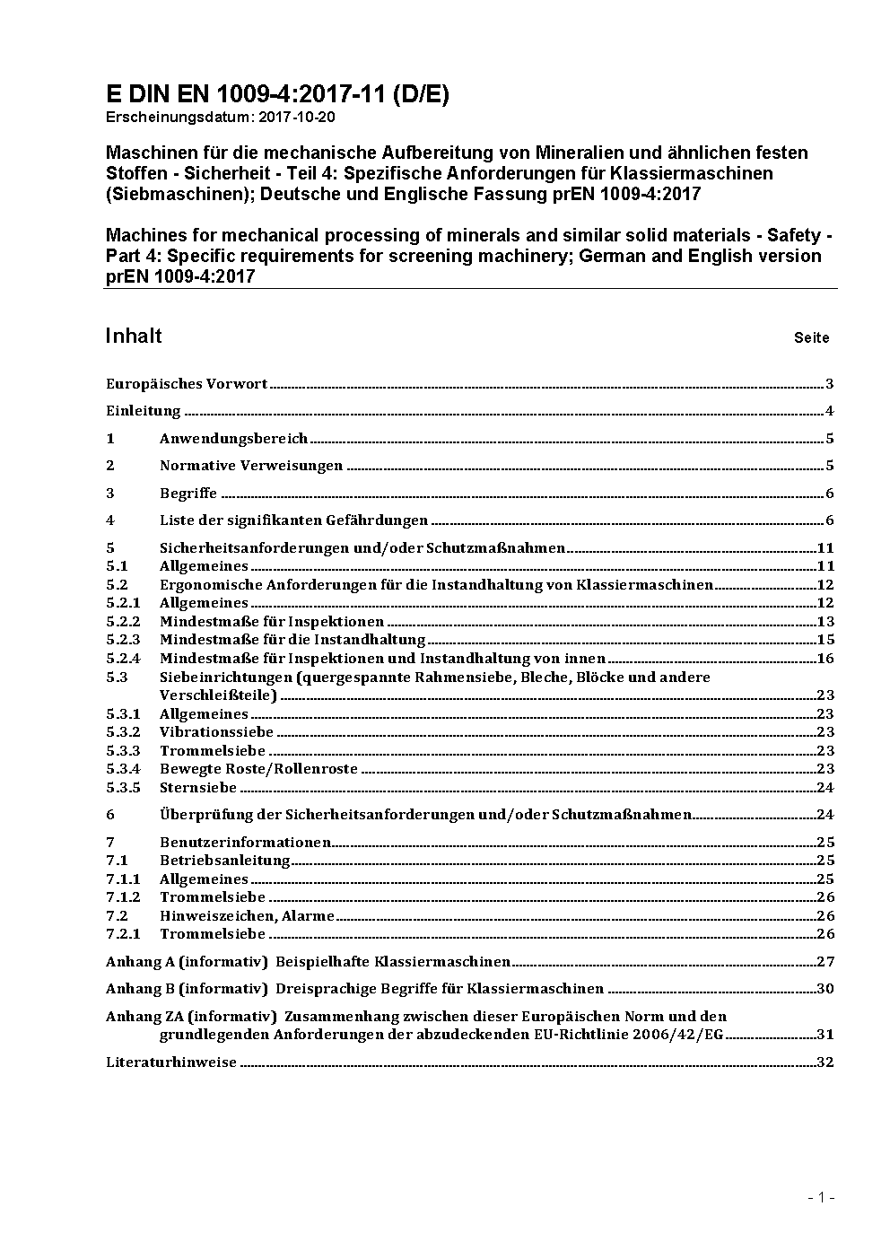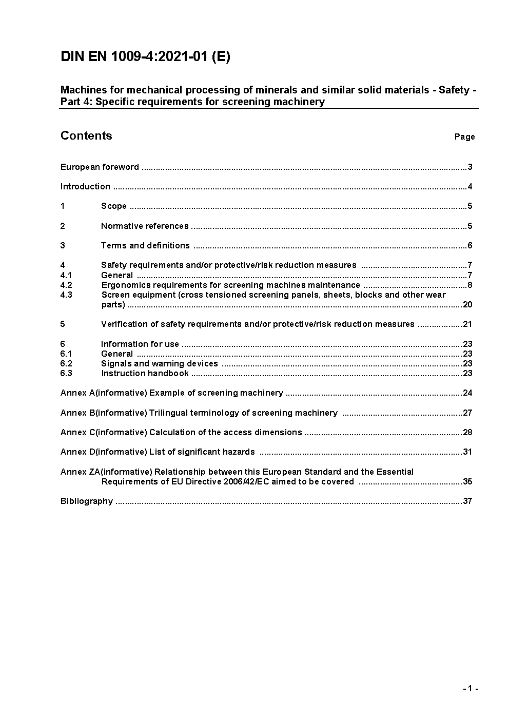 Maschinen für die mechanische Aufbereitung von Mineralien und ähnlichen festen Stoffen - Sicherheit - Teil 4: Spezifische Anforderungen für Klassiermaschinen (Siebmaschinen); Deutsche Fassung EN 1009-4:2020 / Achtung: Gilt in Verbindung mit DIN EN 1009-1 (2021-01)