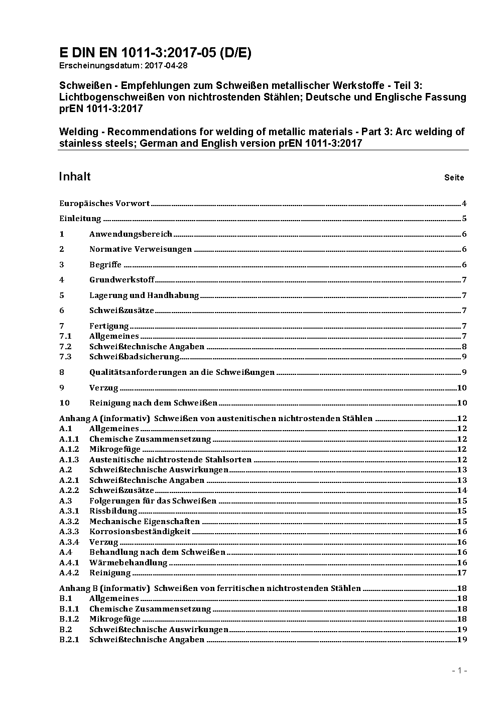 Welding - Recommendations for welding of metallic materials - Part 3: Arc welding of stainless steels; German and English version prEN 1011-3:2017