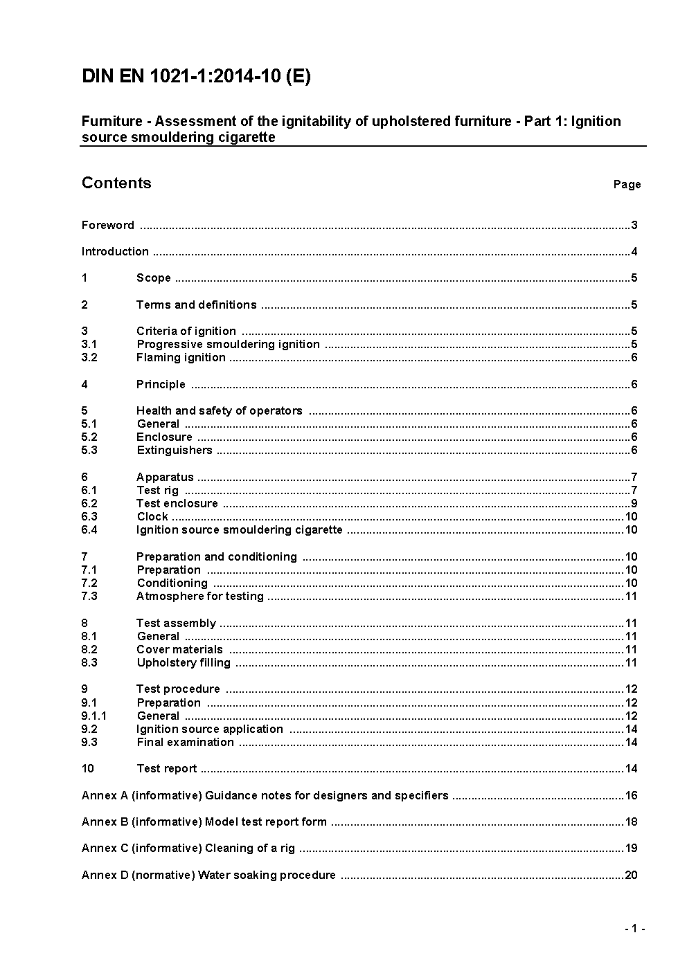 This European Standard specifies a test method to assess the ignitability of material combinations, such as covers and fillings used in upholstered seating, when subjected to a smouldering cigarette as an ignition source. The test measures only the ignitability of a combination of materials used in upholstered seating and not the ignitability of a particular finished item of furniture incorporating these materials. They give an indication of, but cannot guarantee, the ignition behaviour of the finished item of furniture. The standard contains four annexes: Annex A (informative) Guidance notes for designers and specifiers Annex B (informative) Model report form Annex C (informative) Cleaning of a rig Annex D (normative) Water soaking procedure