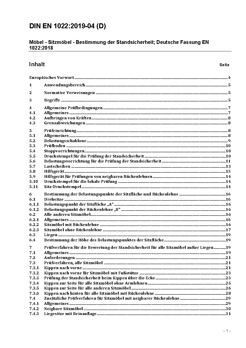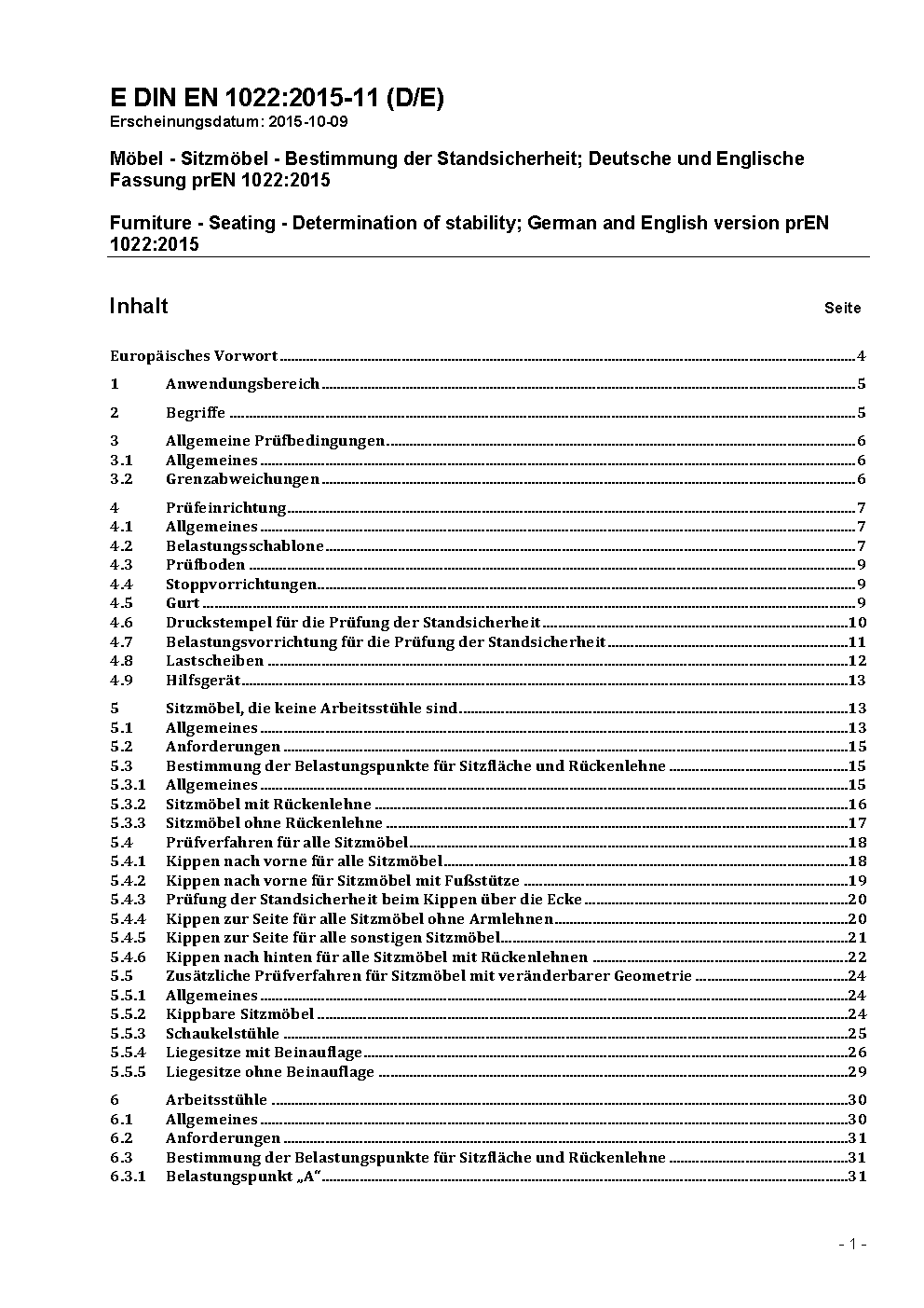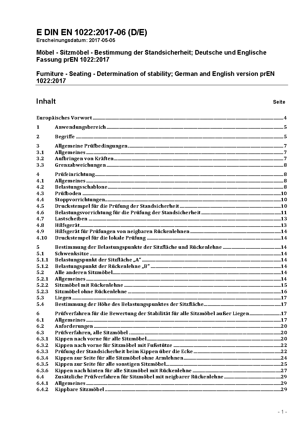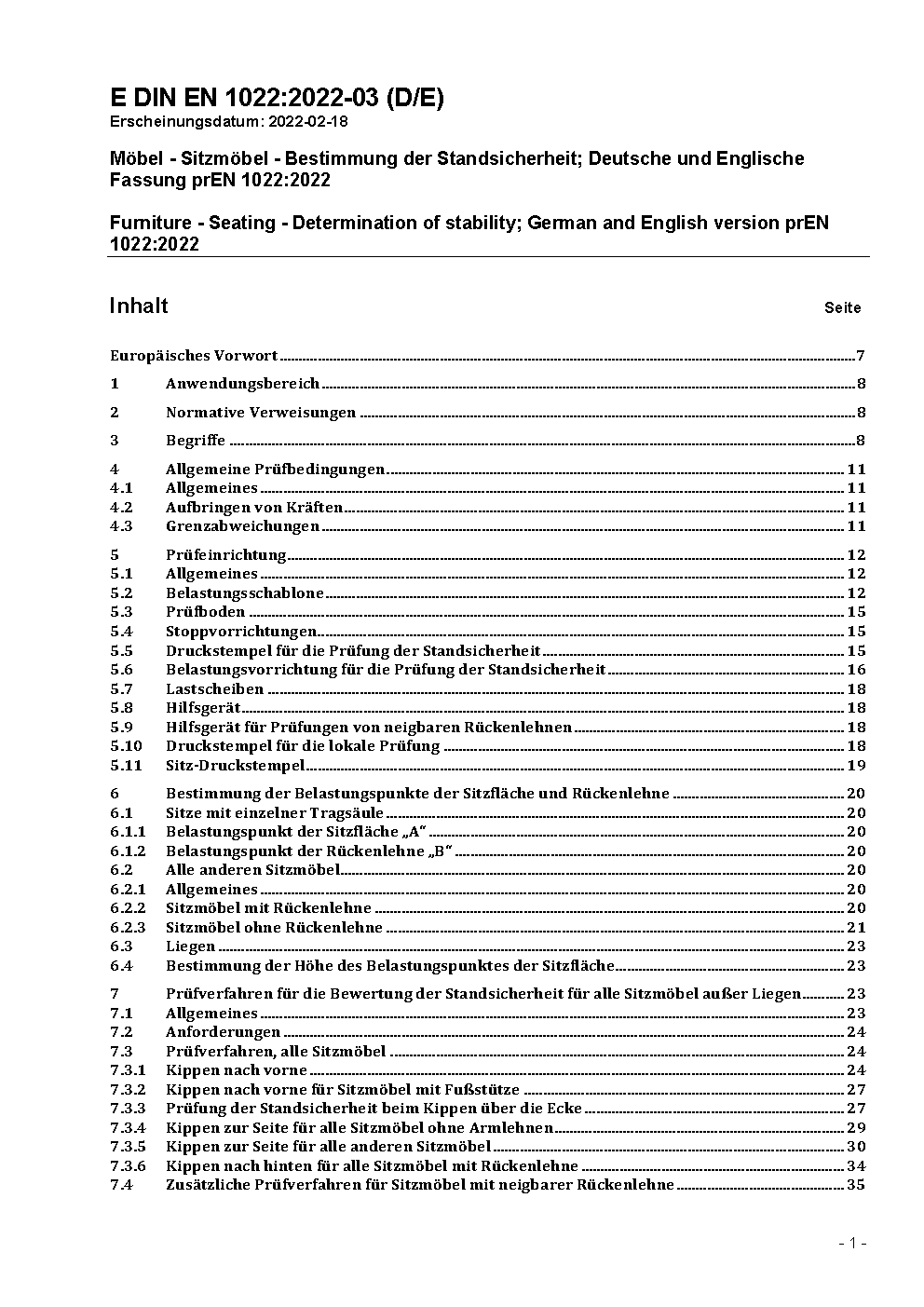 Domestic furniture - Seating - Determination of stability; German version EN 1022:2005