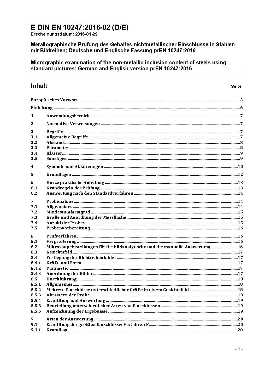 Micrographic examination of the non-metallic inclusion content of steels using standard pictures; German and English version prEN 10247:2016