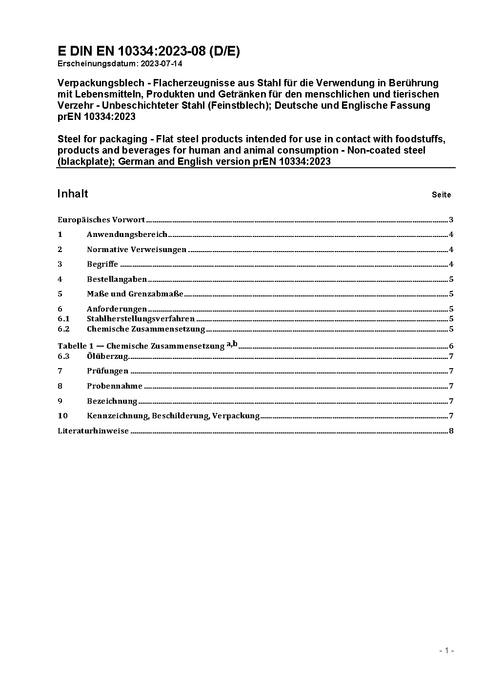 Steel for packaging - Flat steel products intended for use in contact with foodstuffs, products and beverages for human and animal consumption - Non-coated steel (blackplate); German version EN 10334:2005