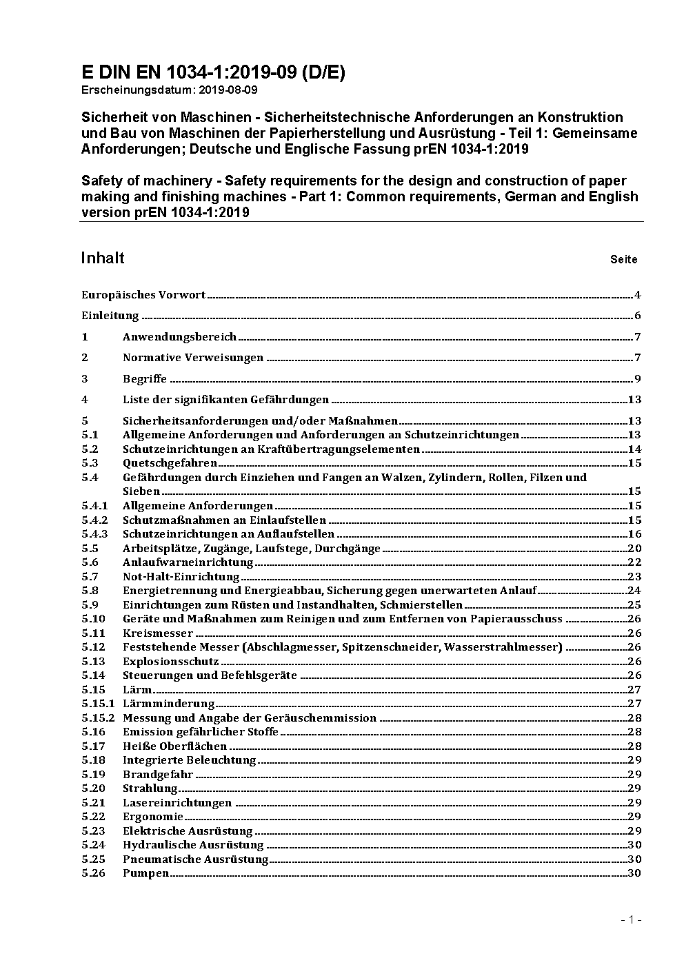 Sicherheit von Maschinen - Sicherheitstechnische Anforderungen für Konstruktion und Bau von Maschinen der Papierherstellung und Ausrüstung - Teil 1: Gemeinsame Anforderungen; Deutsche Fassung prEN 1034-1:1999