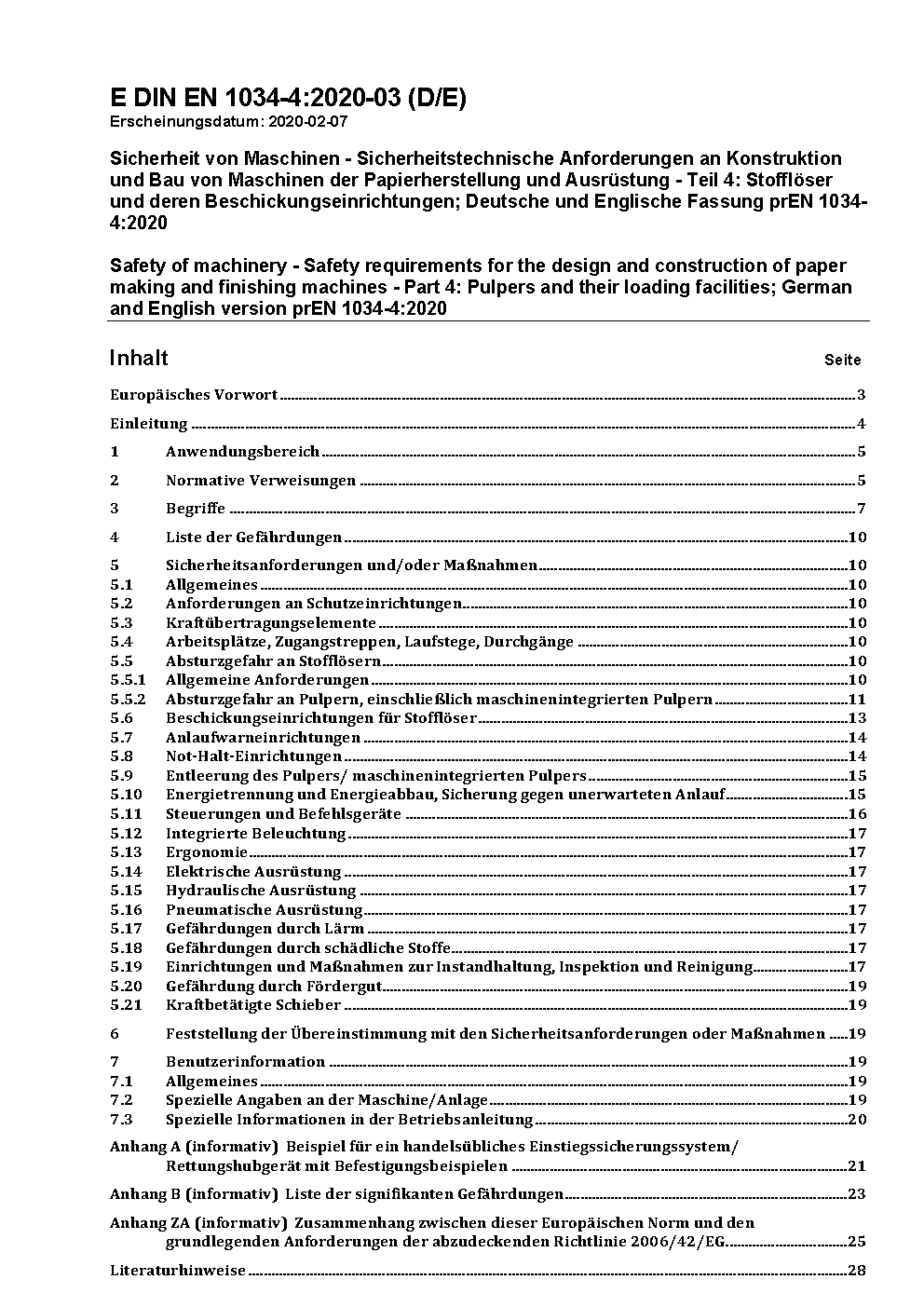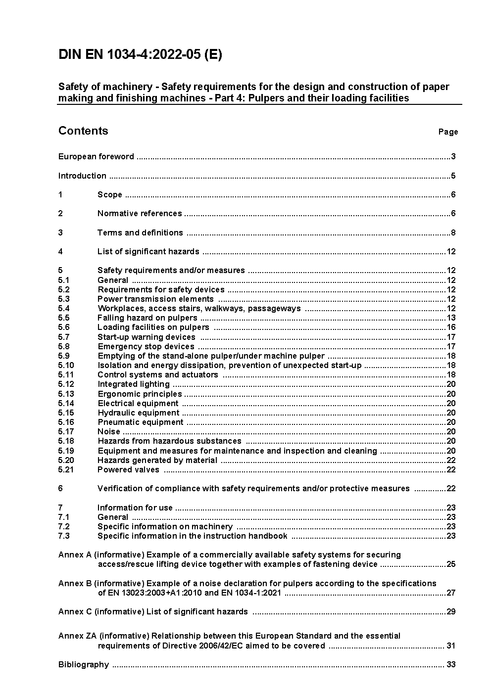 Sicherheit von Maschinen - Sicherheitstechnische Anforderungen an Konstruktion und Bau von Maschinen der Papierherstellung und Ausrüstung - Teil 4: Stofflöser und deren Beschickeinrichtungen; Deutsche Fassung prEN 1034-4:2005