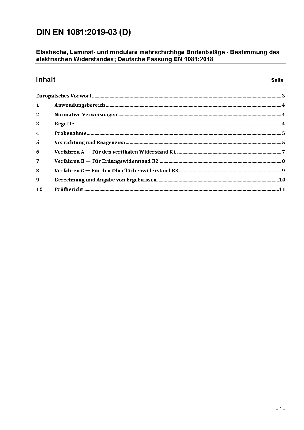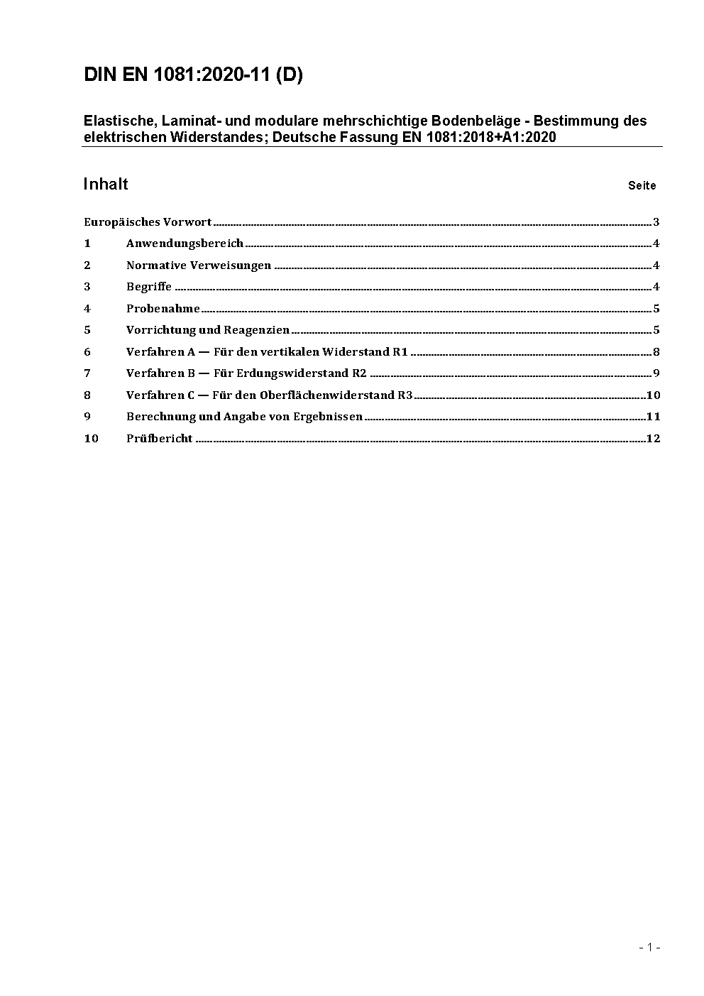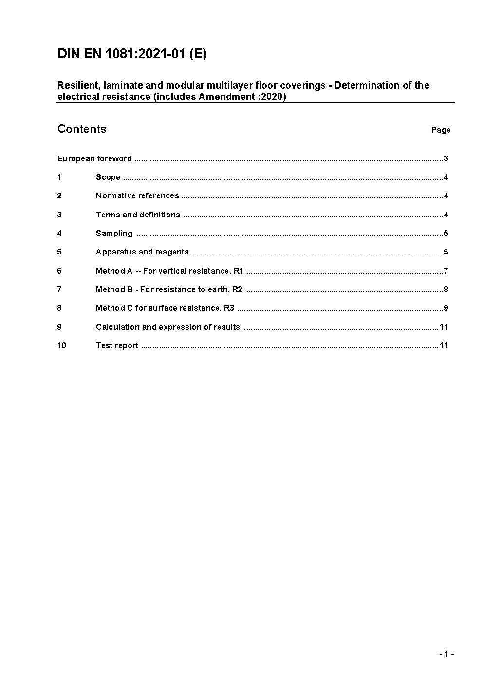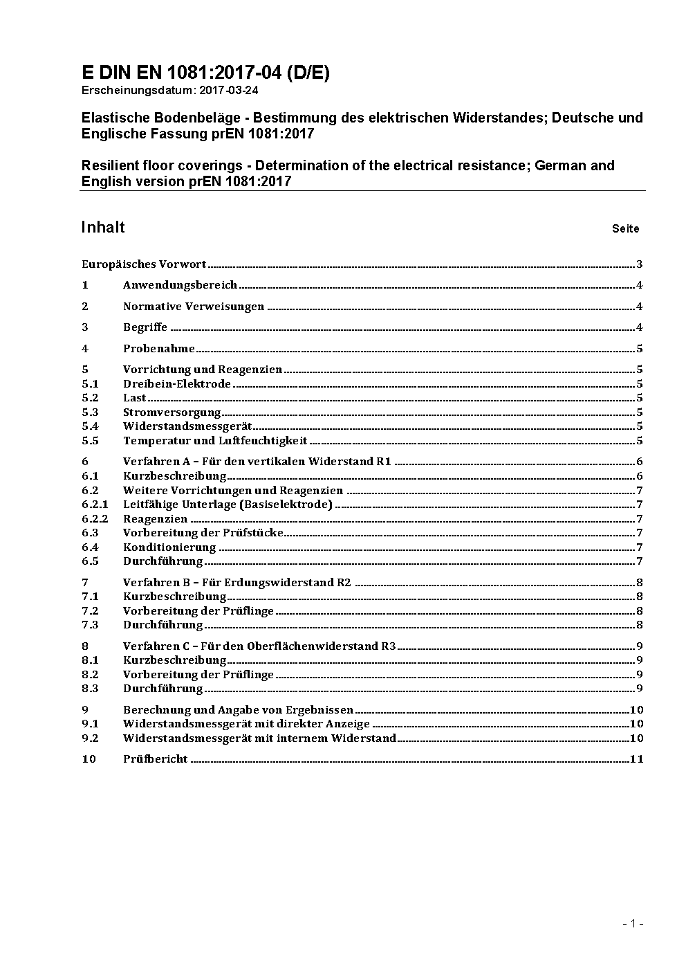 The document specifies the determination for the vertical resistance on a floor covering, one determination for the surface restistance of a floor covering and one determination for the restistance to earth of a floor covering after installation.