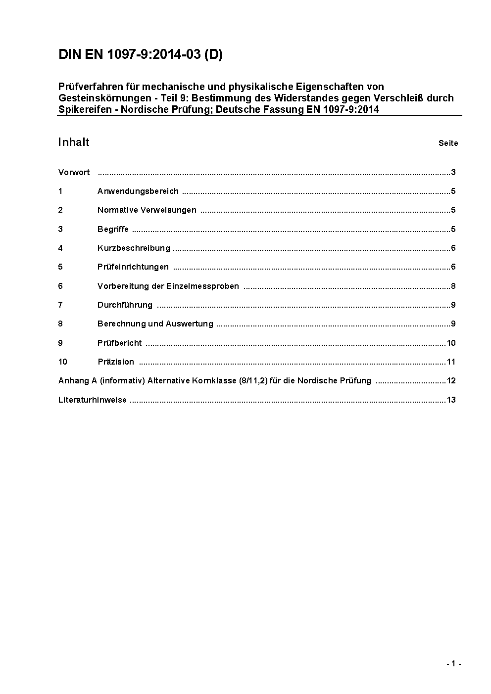 Tests for mechanical and physical properties of aggregates - Part 9: Determination of the resistance to wear by abrasion from studded tyres - Nordic test; German version EN 1097-9:1998 + A1:2005