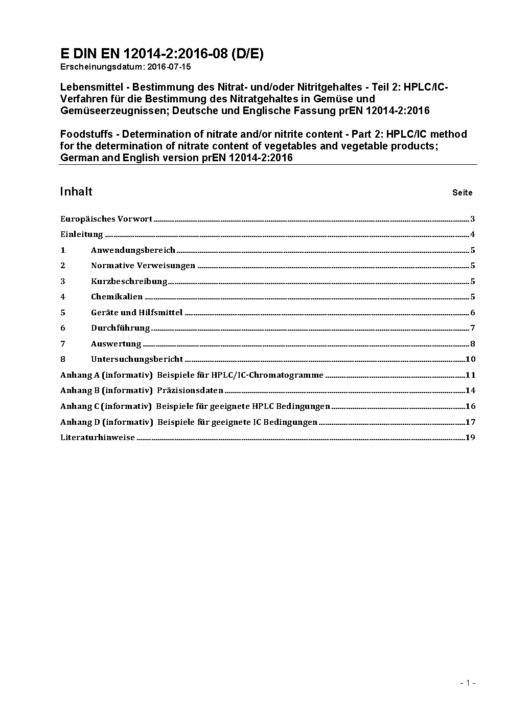 Foodstuffs - Determination of nitrate and/or nitrite content - Part 2: HPLC/IC method for the determination of nitrate content of vegetables and vegetable products; German and English version prEN 12014-2:2016