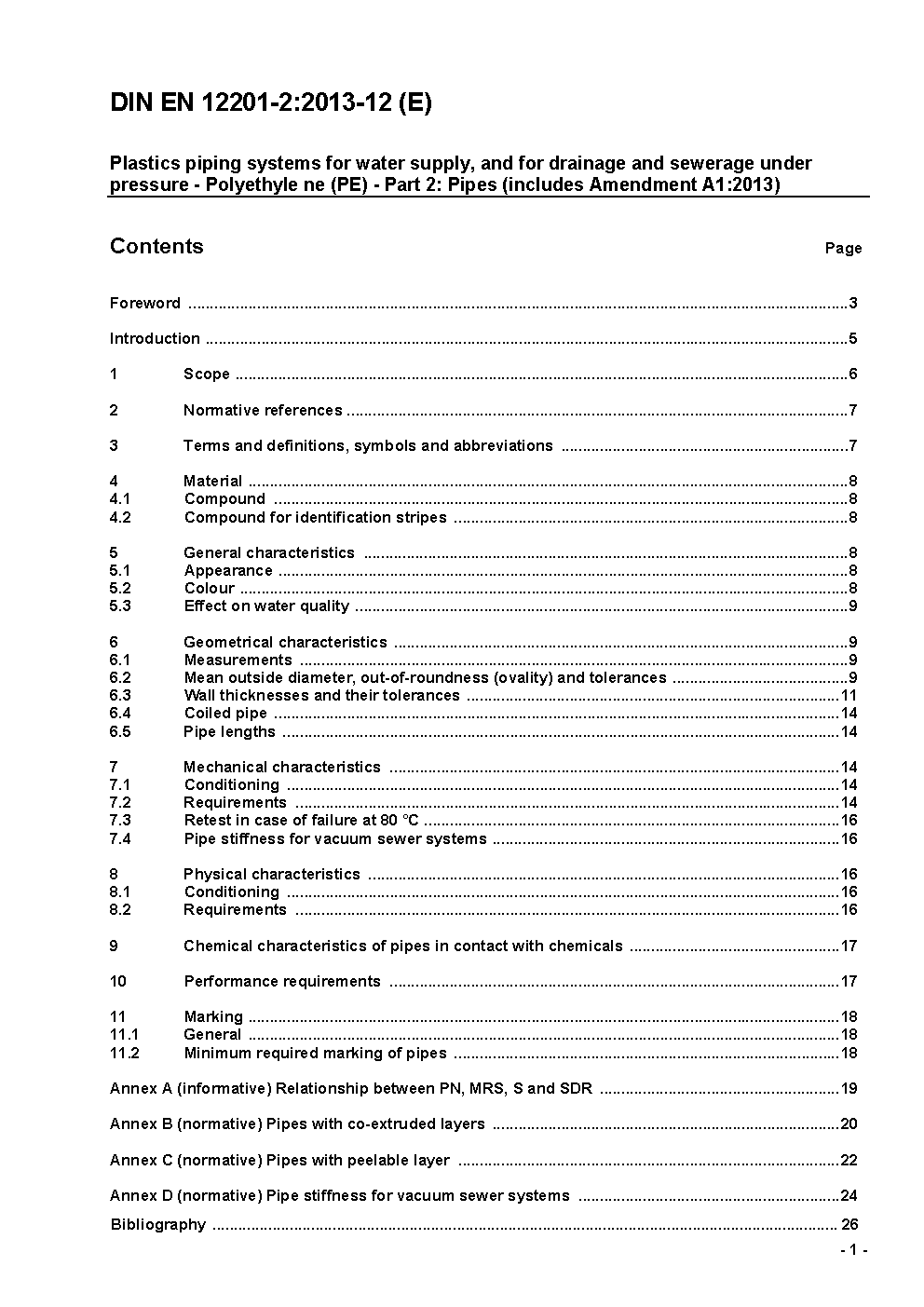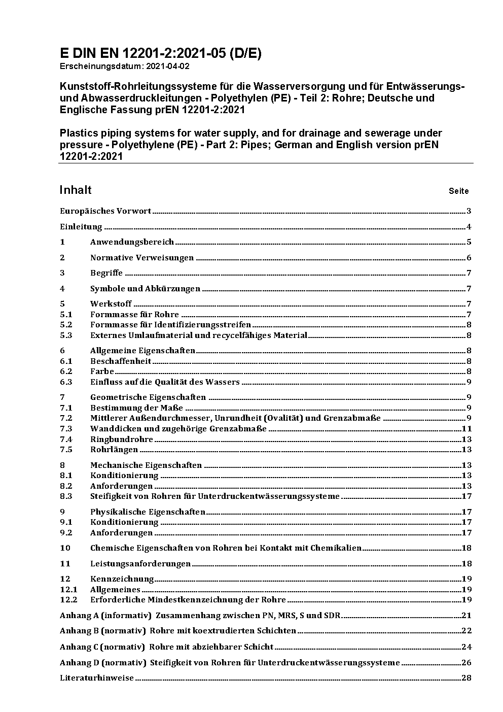 DIN EN 12201-2 specifies the characteristics of pipes made from polyethylene (PE 100, PE 80 and PE 40) for buried and above ground applications, intended for the conveyance of water for human consumption, including raw water prior to treatment, drainage and sewerage under pressure, vacuum sewer systems, and water for other purposes. It also specifies the test parameters for the test methods referred to in this standard. In conjunction with DIN EN 12201-1 and DIN EN 12201-3 to -5 it is applicable to PE pipes, their joints and to joints with components of PE and other materials intended to be used under the following conditions: a) allowable operating pressure, PFA, up to 25 bar; b) an operating temperature of 20 °C as a reference temperature; c) buried in the ground; d) sea outfalls; e) laid in water; f) above ground, including pipes suspended below bridges. DIN EN 12201 covers a range of allowable operating pressures and gives requirements concerning colours and additives