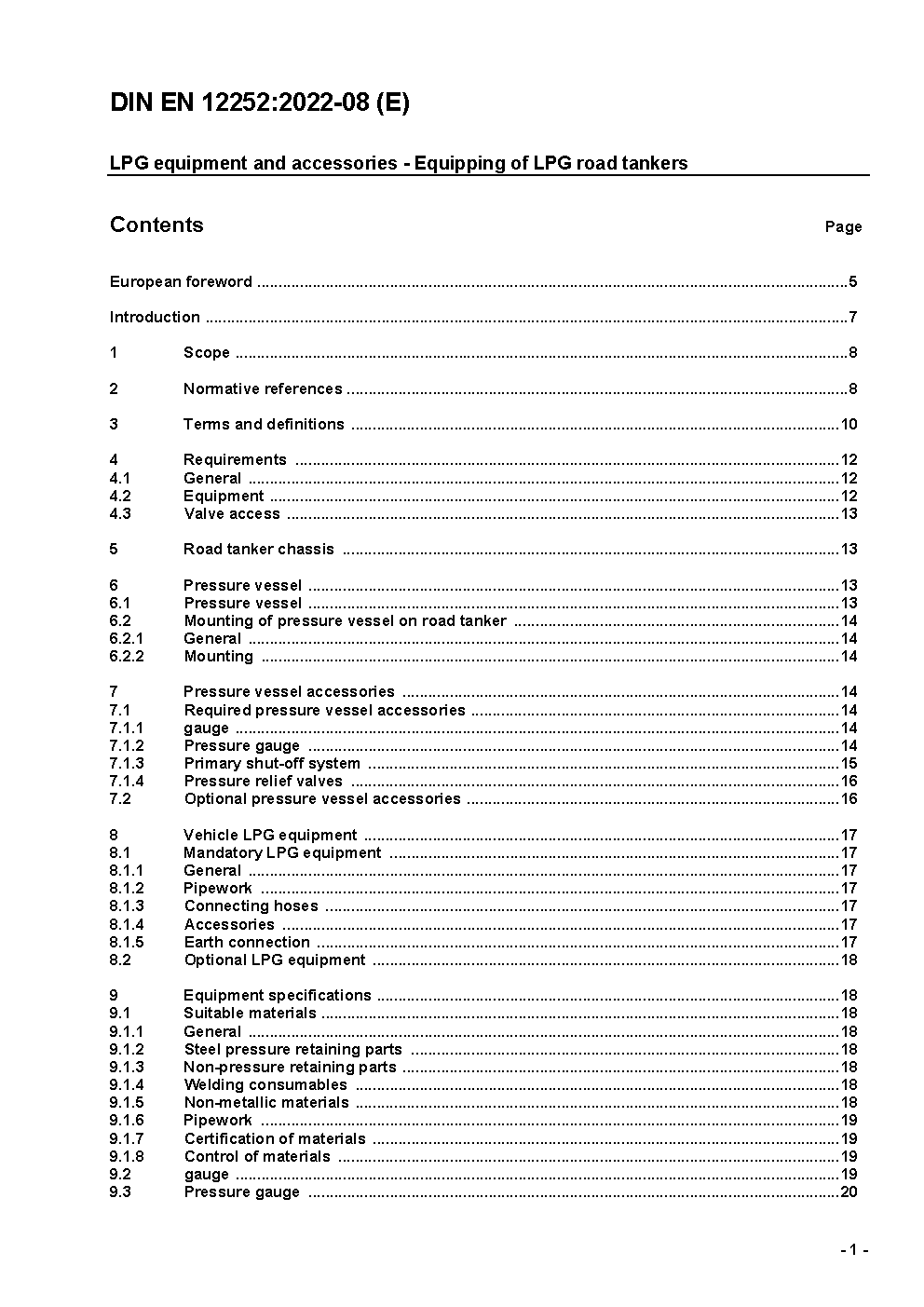 This European Standard specifies equipment and accessories for road tankers used for the transport of Liquefied Petroleum Gas (LPG) and identifies the equipment that is considered necessary to ensure that filling, transportation and discharge operations can be carried out safely.The standard also identifies additional equipment and accessories that may be used on road tankers carrying LPG. NOTE This European Standard should not exclude the use of alternative designs, materials and equipment testing which provide a similar level of safety. This standard does not apply to ""tank-containers"" and ""battery-vehicles"" used for the transportation of LPG.