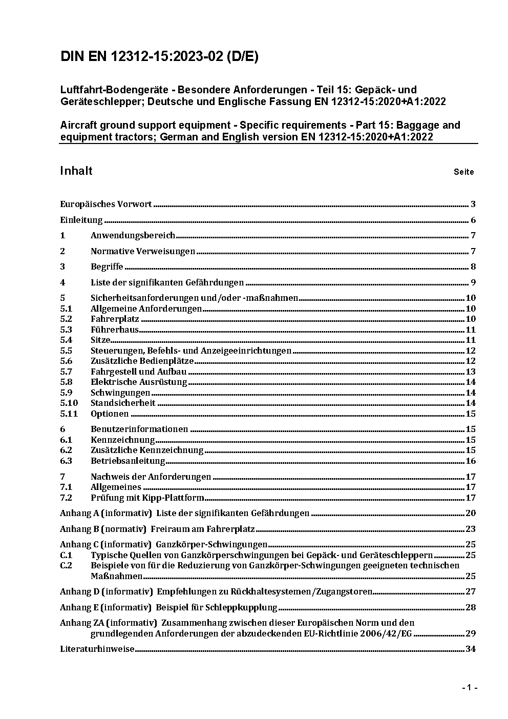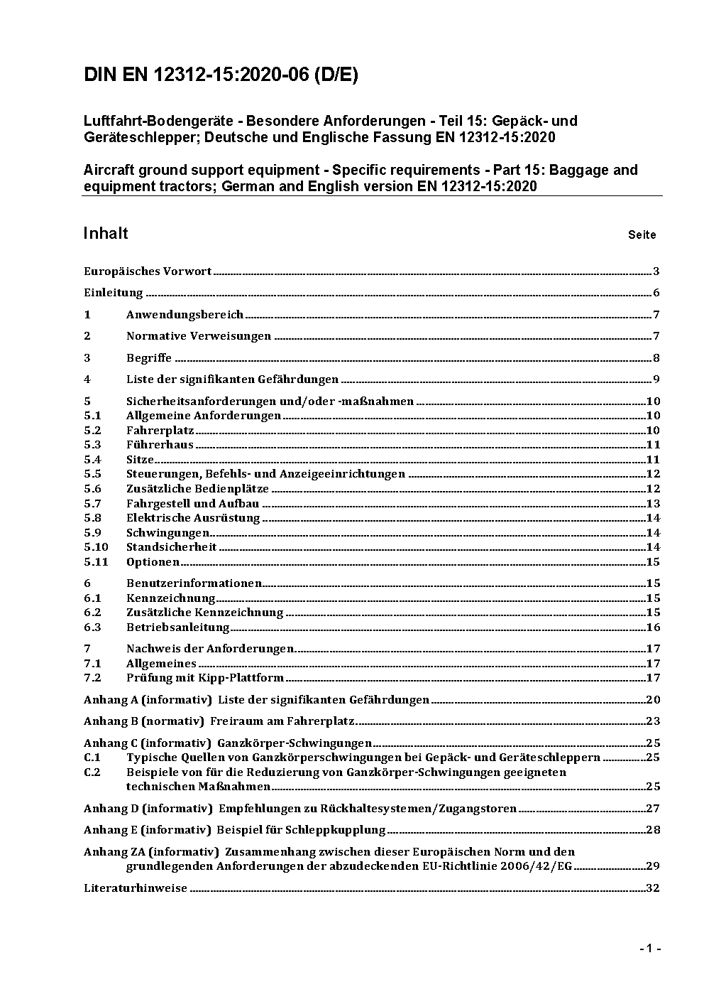Luftfahrt-Bodengeräte - Besondere Anforderungen - Teil 15: Gepäck- und Geräteschlepper; Deutsche und Englische Fassung EN 12312-15:2020+A2:2025 / Achtung: Daneben gilt DIN EN 12312-15 (2023-02) noch bis 2026-01-31.*Gilt in Verbindung mit DIN EN 1915-1 (2023-12), DIN EN 1915-2 (2009-06), DIN EN 1915-3 (2009-06), DIN EN 1915-4 (2009-06)