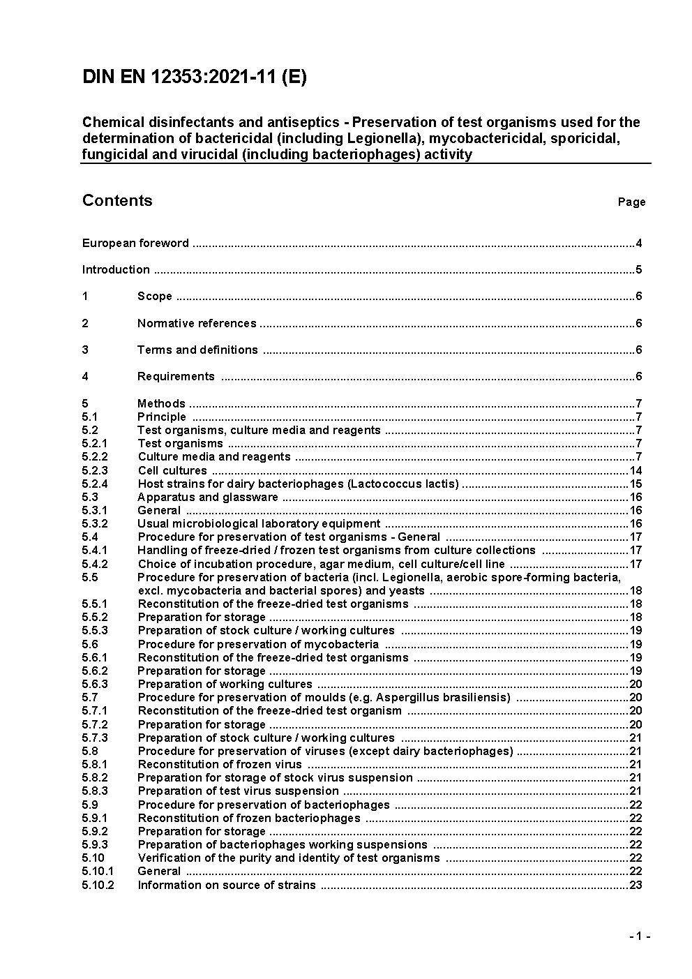 This European Standard specifies methods for keeping test organisms used and defined in European Standards for the determination of bactericidal (incl. Legionella pneumophila), mycobactericidal, sporicidal, fungicidal and virucidal (incl. bacteriophages) activity of chemical disinfectants and antiseptics drawn up by CEN/TC 216. These methods for keeping test organisms can only be carried out in connection with at least one of those standards where a reference to this standard is established. NOTE 1: Annex A (informative) contains a non-exhaustive list of test organisms for which this standard can be applied. NOTE 2: European Standards (EN and prEN) where this European Standard is referenced are listed in the Bibliography. NOTE 3: A specific part on the preservation of bacterial spores may be added once the results of the ongoing ring trials are available.