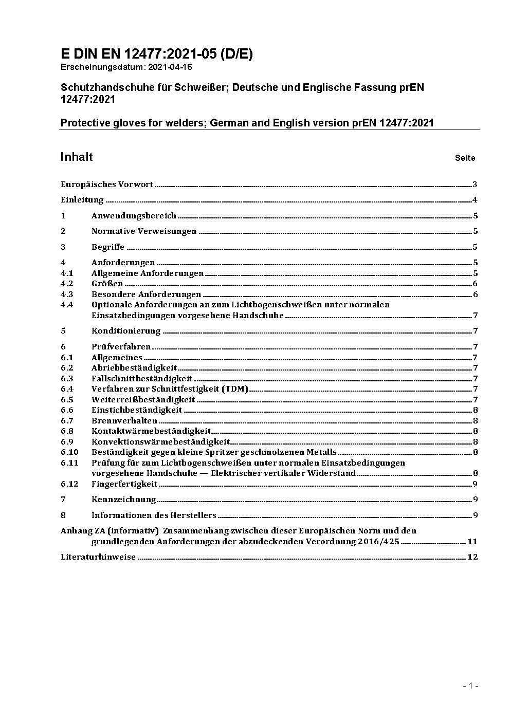 Protective gloves for welders; German version EN 12477:2001 + A1:2005