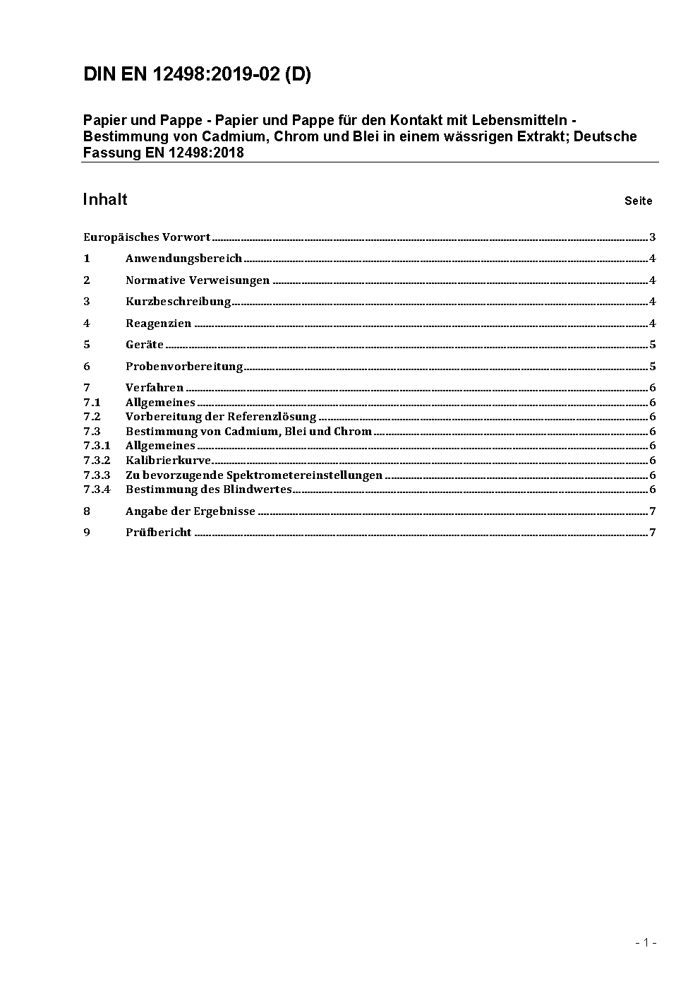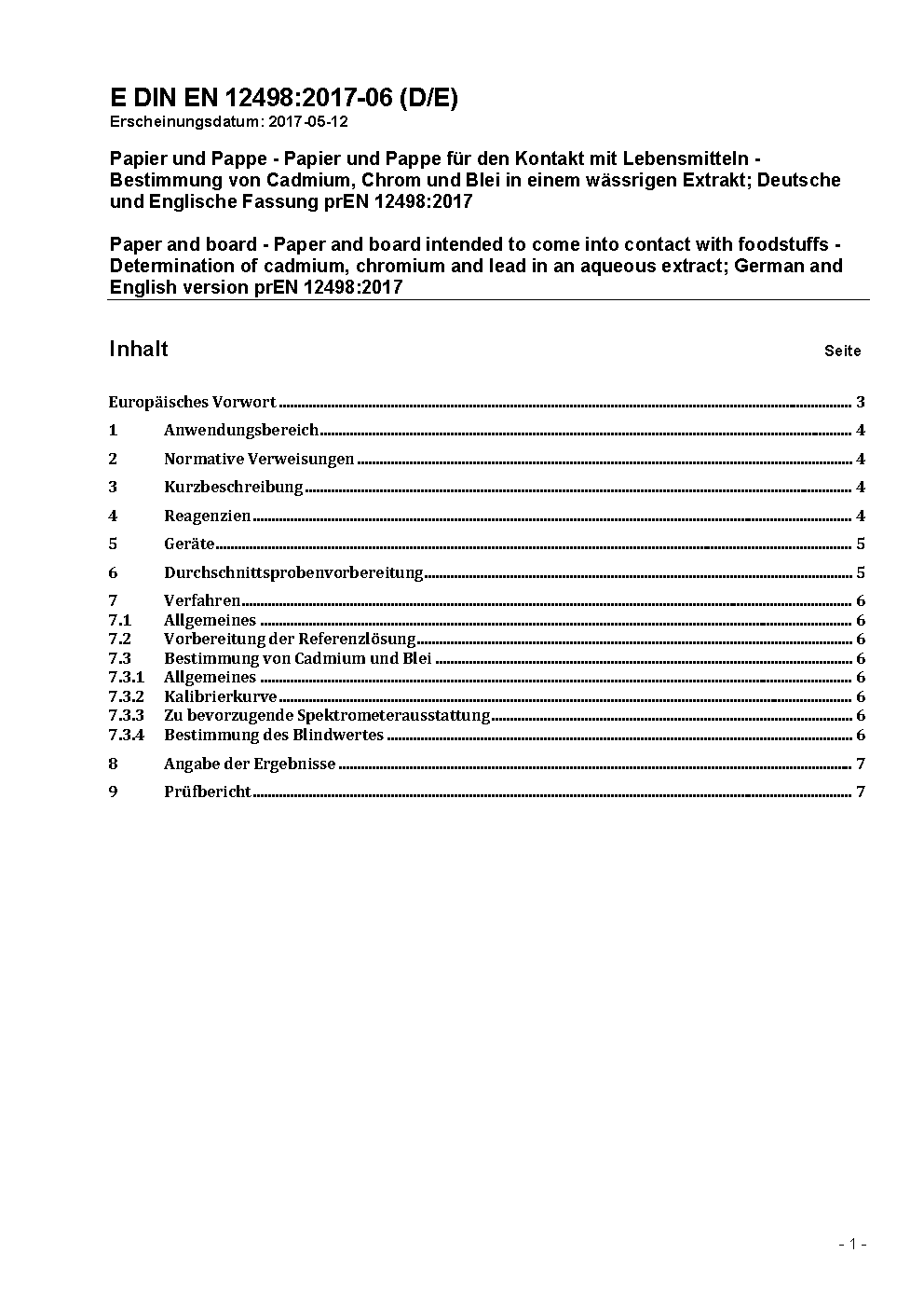 Paper and board - Paper and board intended to come into contact with foodstuffs - Determination of cadmium and lead in an aqueous extract; German version EN 12498:2005
