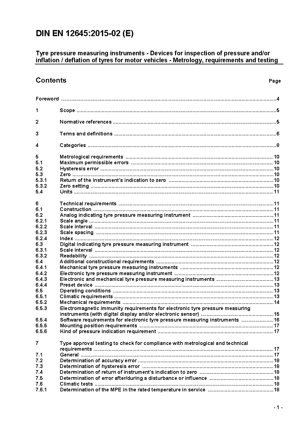 Pressure gauges - Apparatus for inspection of pressure and/or inflation of tyres for motor vehicles - Metrology, requirements and testing; German version EN 12645:1998