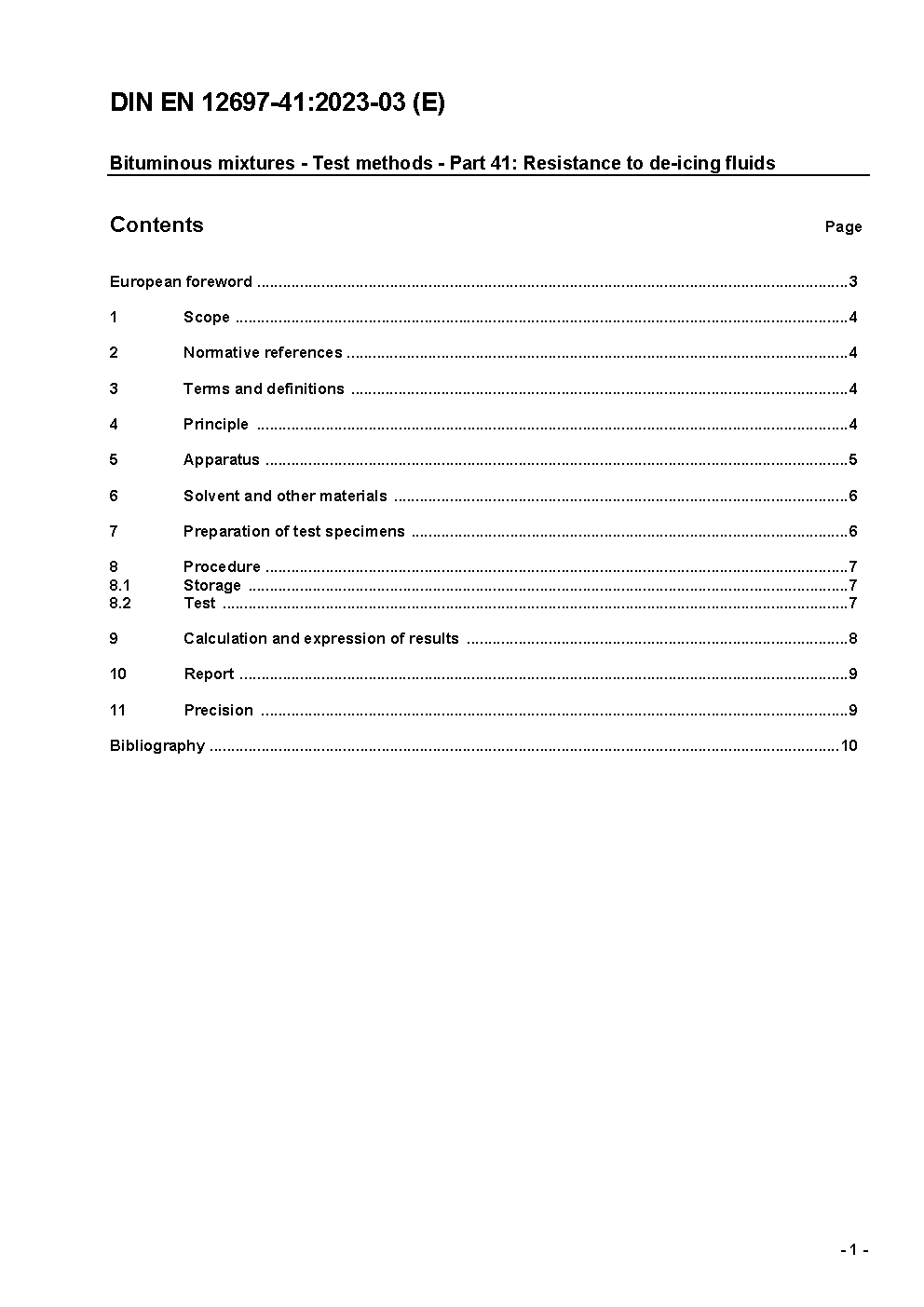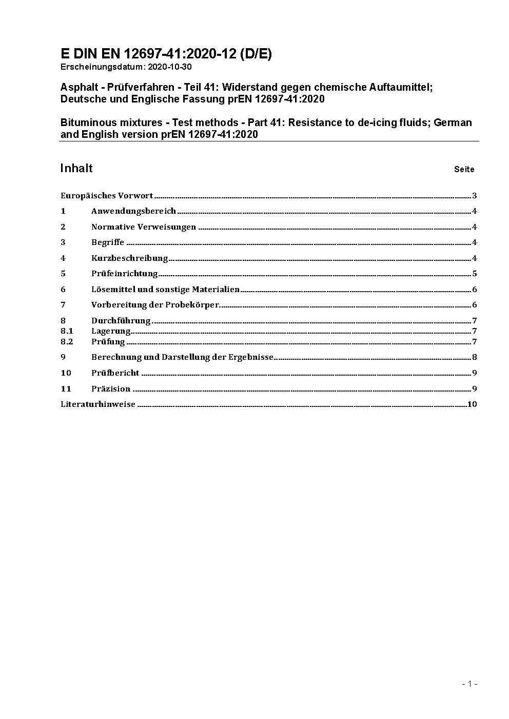 Bituminous mixtures - Test methods for hot mix asphalt - Part 41: Resistance to de-icing fluids; German version EN 12697-41:2005
