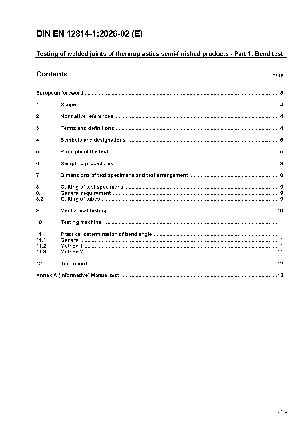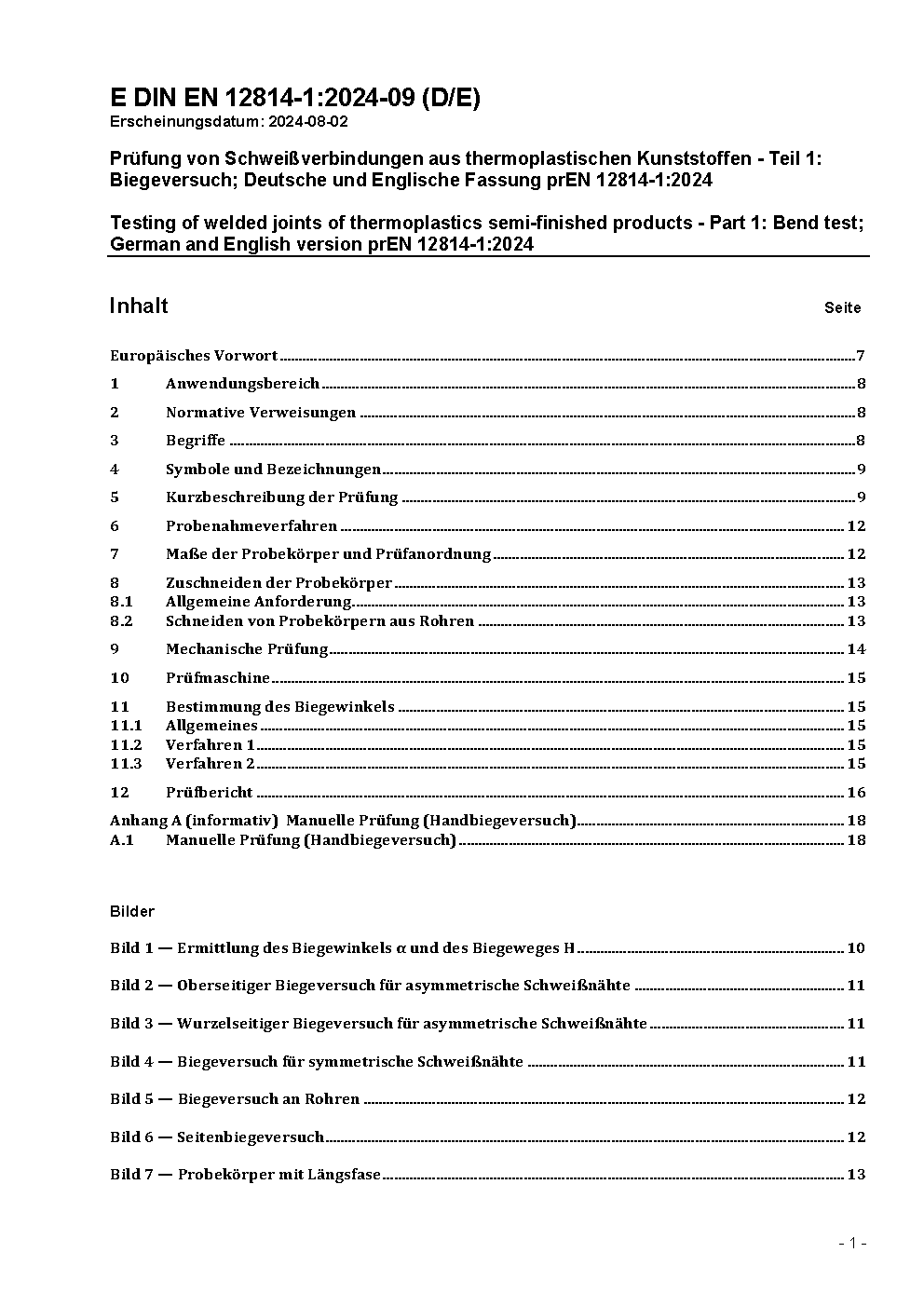 Prüfung von Schweißverbindungen aus thermoplastischen Halbzeugen - Teil 1: Biegeversuch; Deutsche Fassung prEN 12814-1:1997
