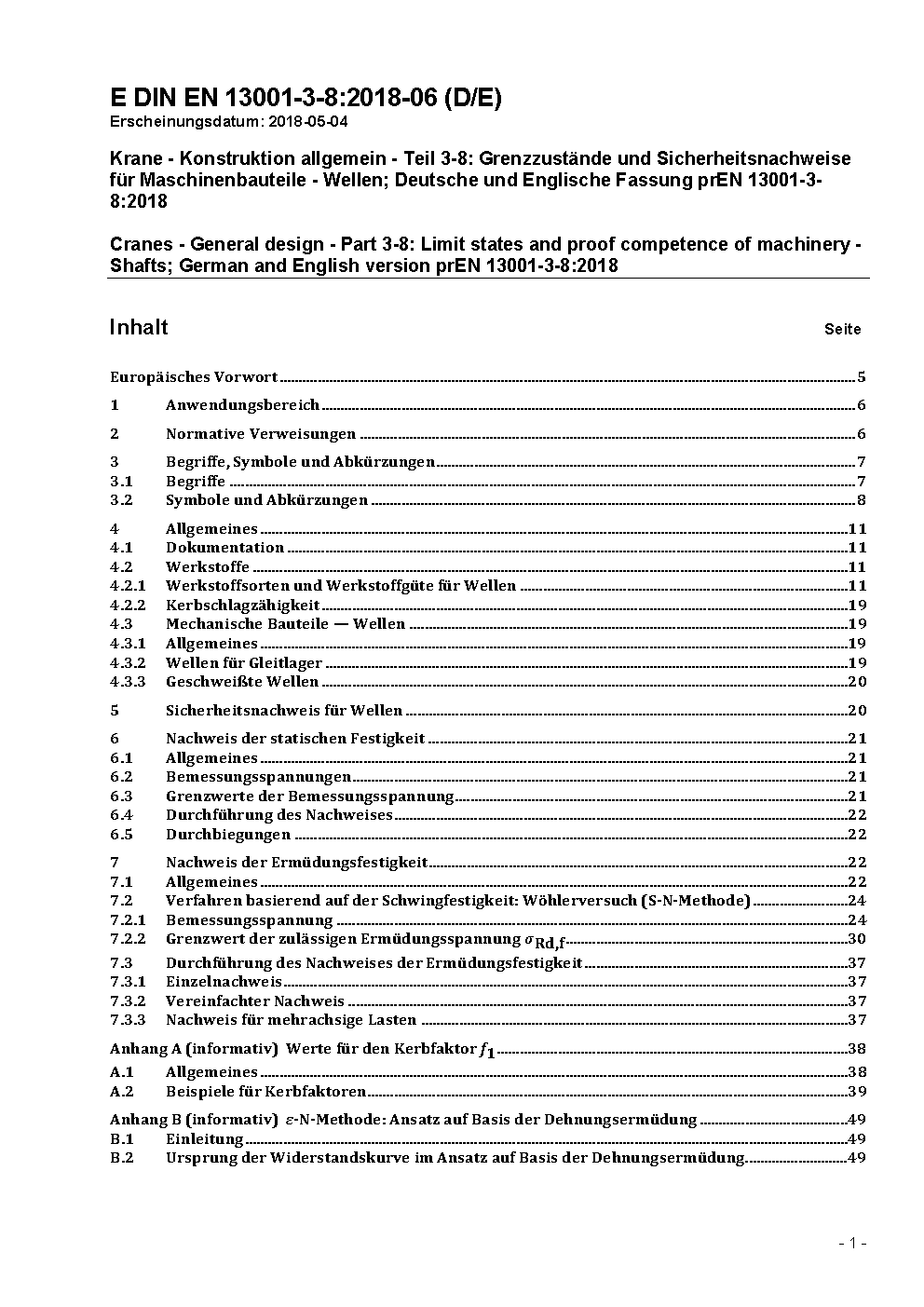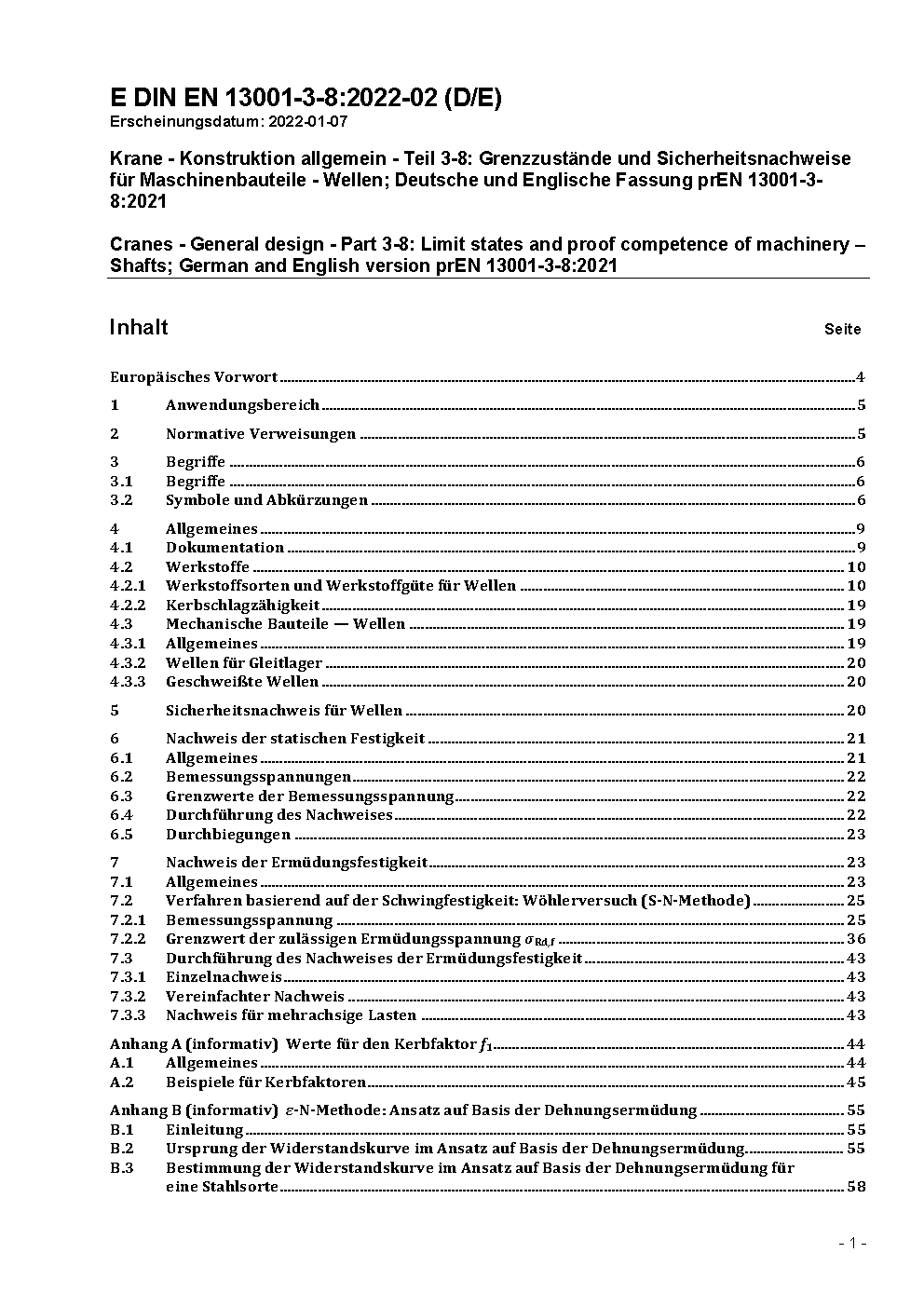 Krane - Konstruktion allgemein - Teil 3-8: Grenzzustände und Sicherheitsnachweise für Maschinenbauteile - Wellen; Deutsche und Englische Fassung prEN 13001-3-8:2021