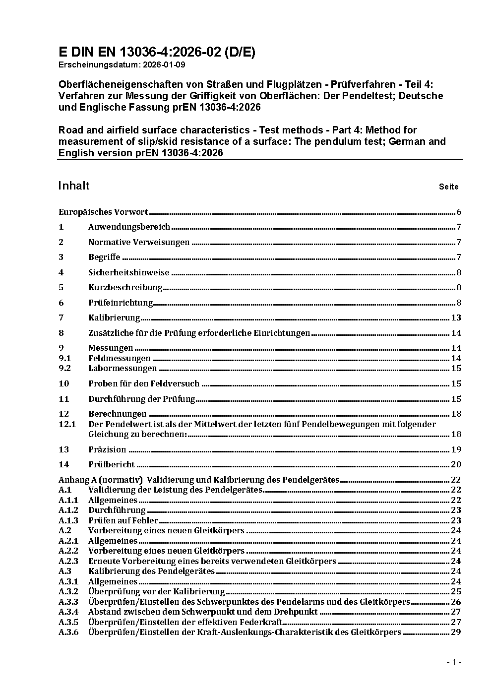 Oberflächeneigenschaften von Straßen und Flugplätzen - Prüfverfahren - Teil 4: Verfahren zur Messung der Griffigkeit von Oberflächen: Der Pendeltest; Deutsche Fassung EN 13036-4:2003