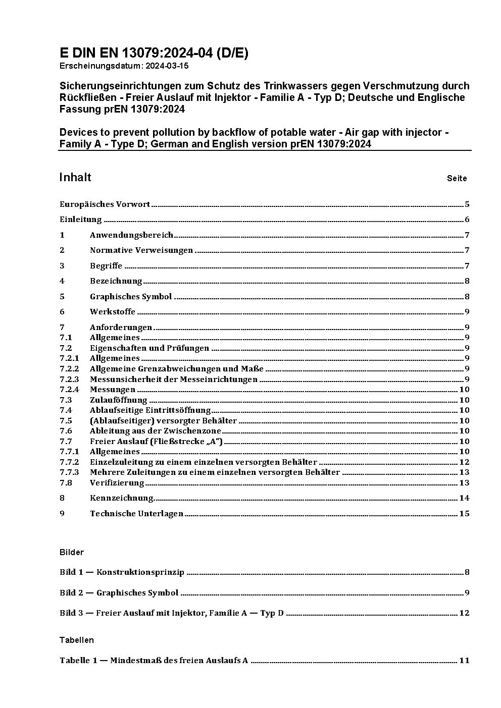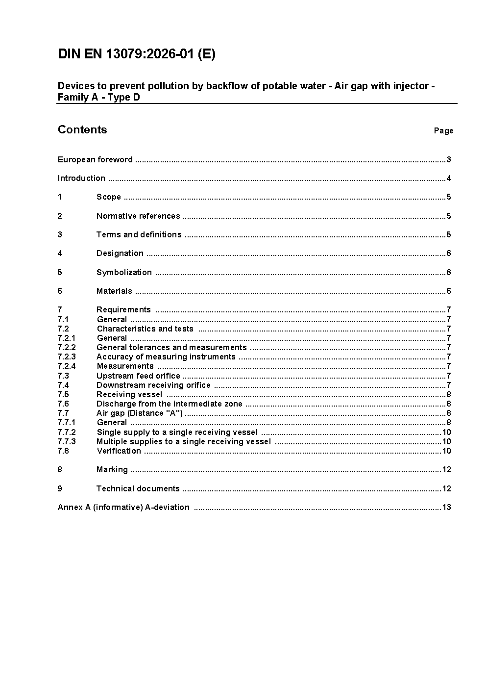 Disconnection devices without moving parts for the prevention of contamination of water by backflow - Specification for type AD air gaps with injector; German version prEN 13079:1997