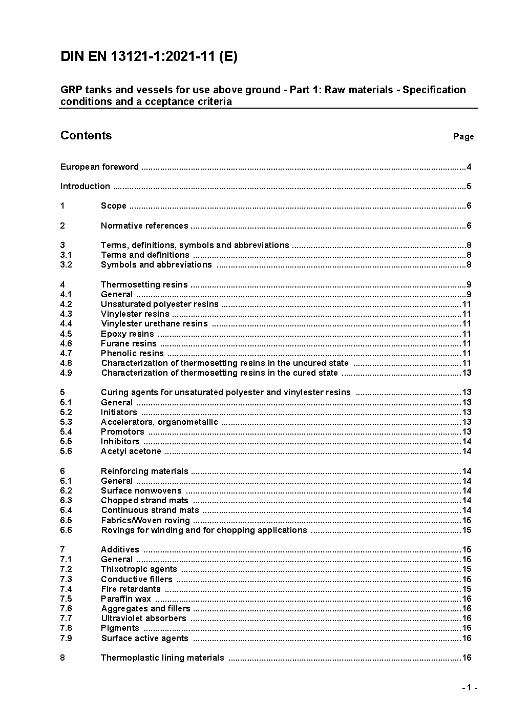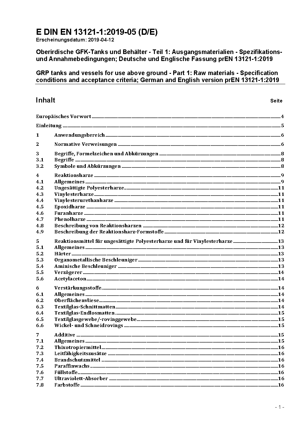 Oberirdische GFK-Tanks und Behälter - Teil 1: Ausgangsmaterialien - Spezifikations- und Annahmebedingungen; Deutsche und Englische Fassung prEN 13121-1:2019