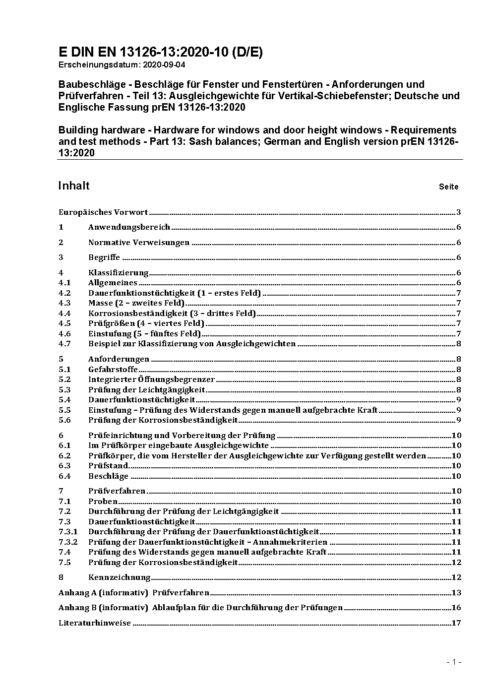 Baubeschläge - Beschläge für Fenster und Fenstertüren - Anforderungen und Prüfverfahren - Teil 13: Ausgleichgewichte für Vertikal-Schiebefenster; Deutsche und Englische Fassung prEN 13126-13:2020