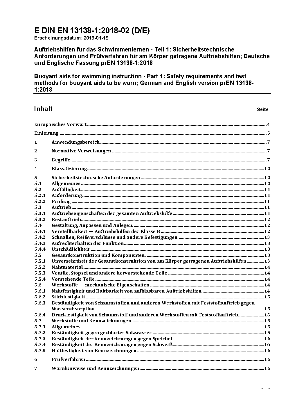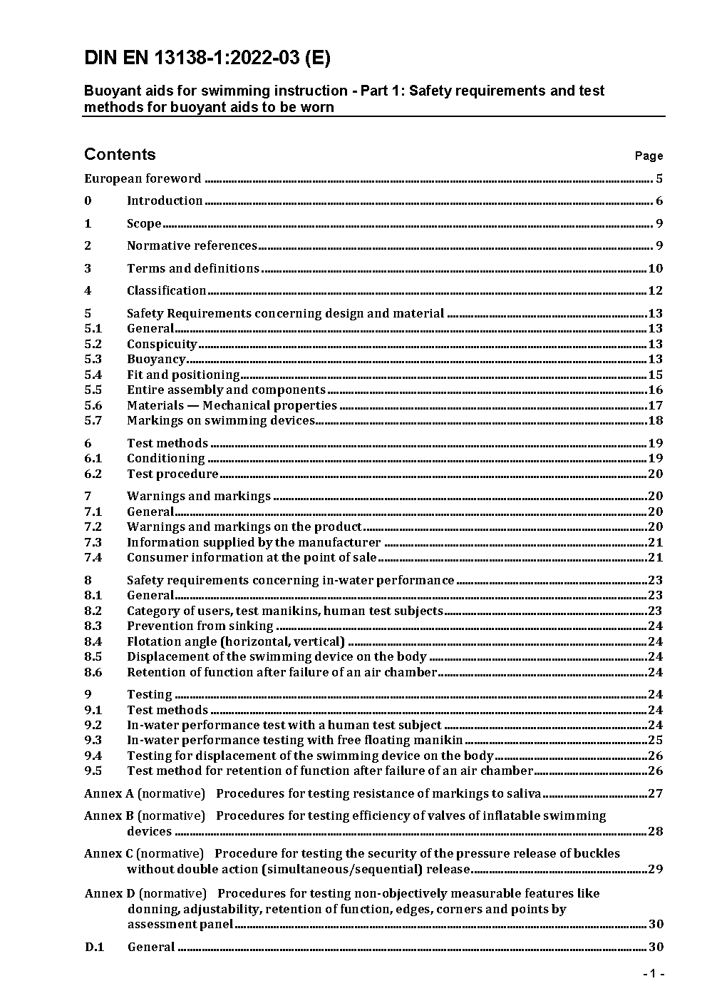 This document specifies safety requirements for construction, performance, sizing, marking and information supplied by the manufacturer for swimming aids intended to assist beginners with movement through the water whilst learning to swim or whilst learning part of a swimming stroke. It also gives methods of test for verification of these requirements. This Part 1 European Standard applies only to devices that are designed to be worn, to be securely attached to the body and which have either inherent buoyancy or can be inflated. It only applies to Class B devices intended to introduce the user to the range of swimming strokes. It does not apply to Class A or Class C devices, to swim rings, lifebuoys, buoyancy aids, lifejackets or aquatic toys.