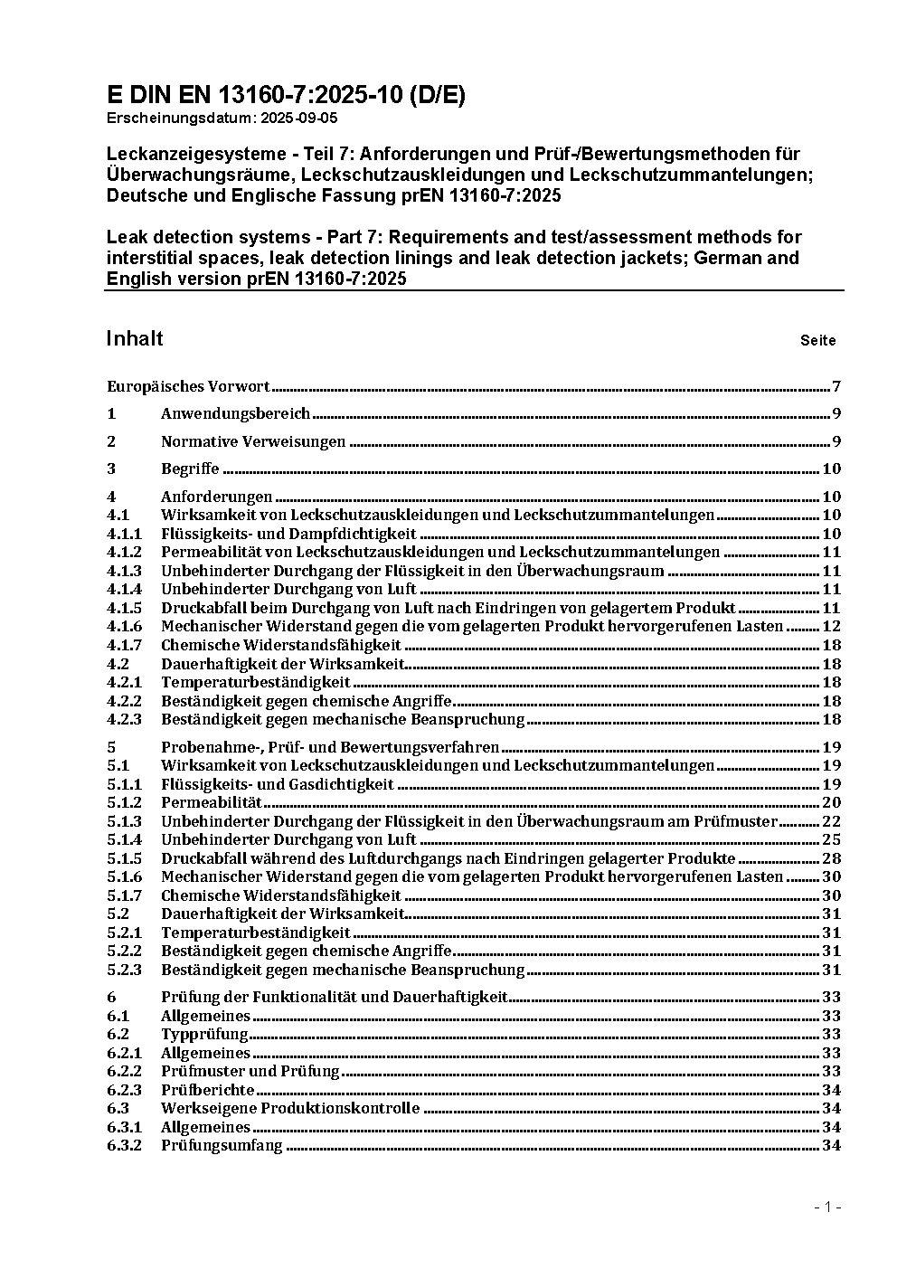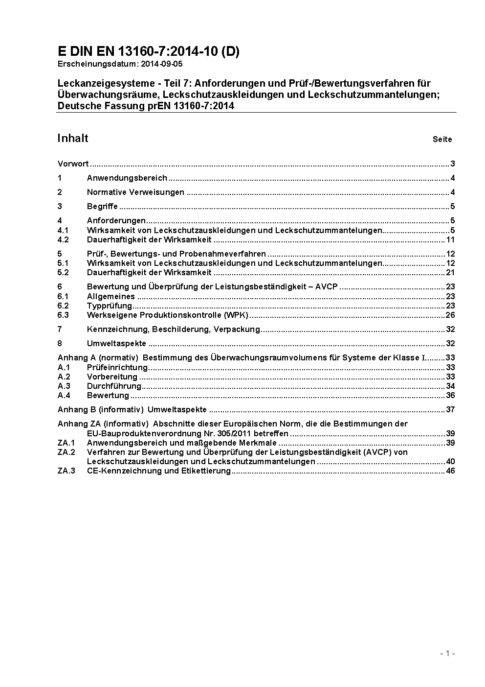 Leak detection systems - Part 7: Requirements and test/assessment methods for interstitial spaces, leak detection linings and leak detection jackets; German version EN 13160-7:2016.
