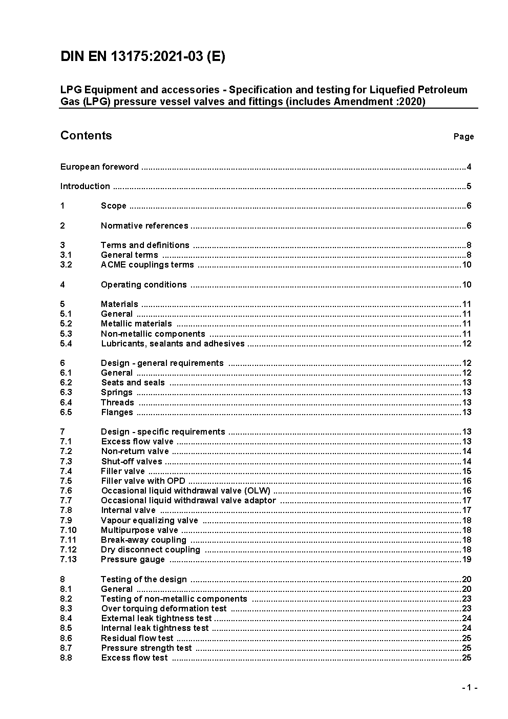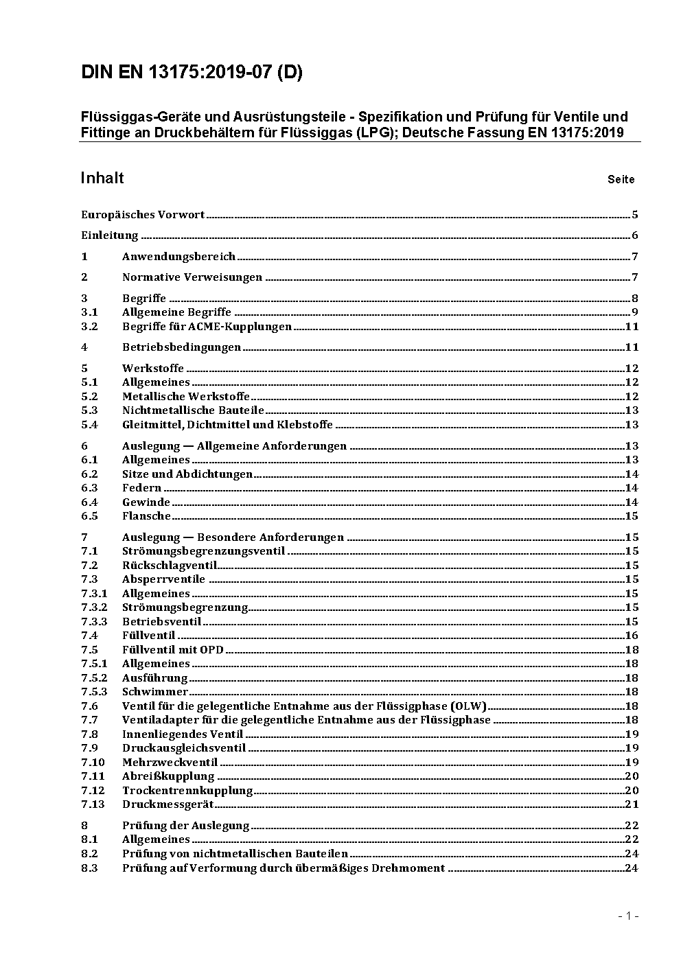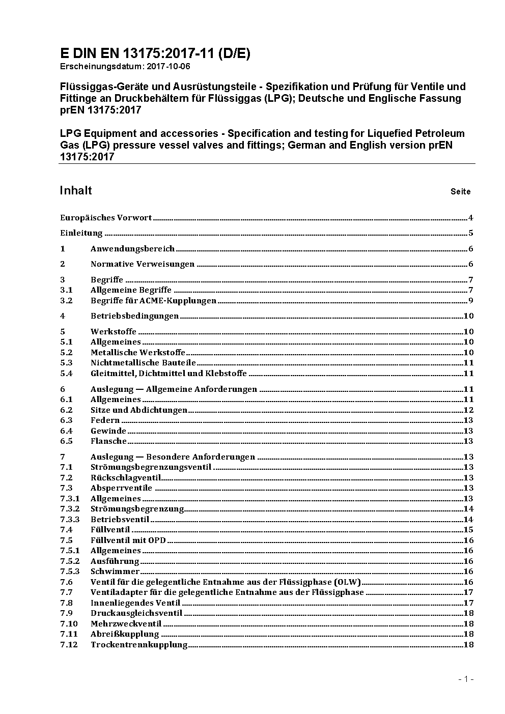 Spezifikation und Prüfung für Armaturen von Flüssiggasbehältern; Deutsche Fassung prEN 13175:1998