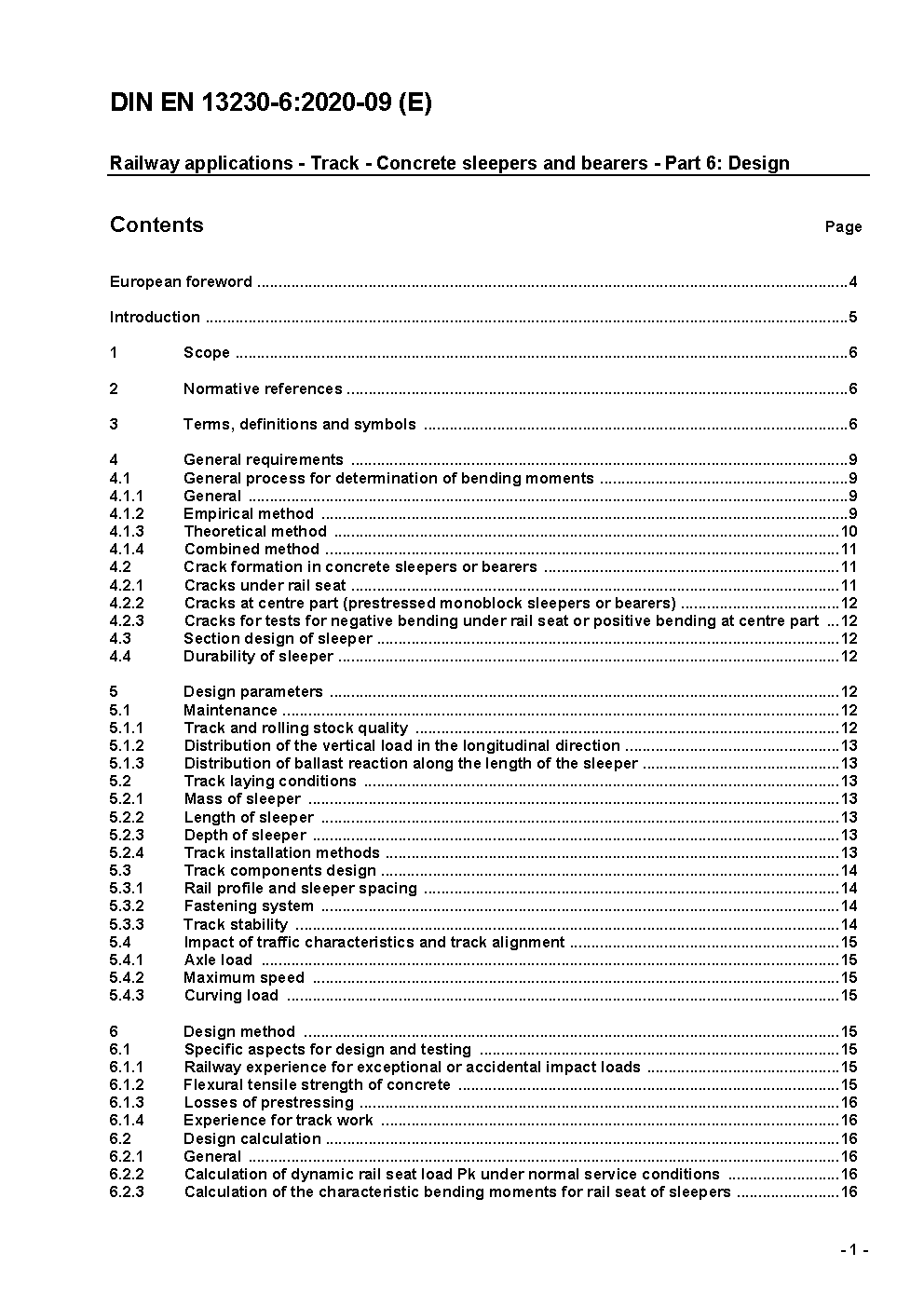 Standardization in the field of concrete sleepers and bearers. This document provides particular design guidance in the following areas: service categories for sleeper designs derivation of design loads including dynamic impact factors calculation of design bending moments selection of dimensions