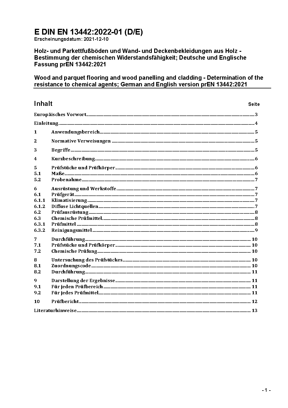 Holzfußboden (einschließlich Parkett) und Wand- und Deckenbekleidung aus Holz - Bestimmung der chemischen Widerstandsfähigkeit (einschließlich Benetzungsmittel); Deutsche Fassung prEN 13442:1999