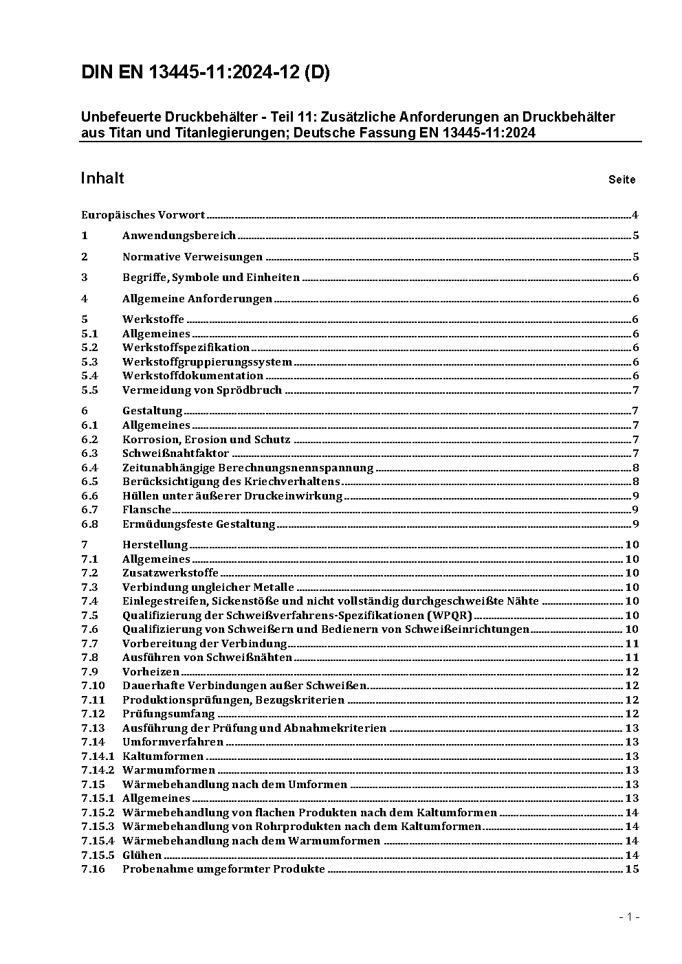 Unbefeuerte Druckbehälter - Teil 11: Zusätzliche Anforderungen an Druckbehälter aus Titan und Titanlegierungen; Deutsche Fassung EN 13445-11:2024