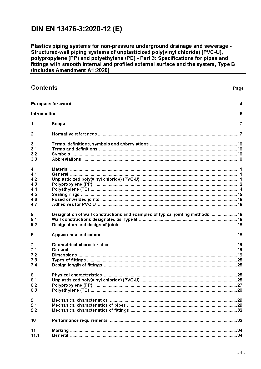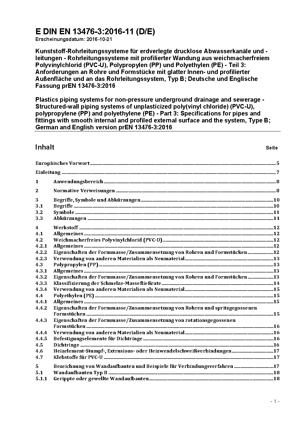 Plastics piping systems for non-pressure underground drainage and sewerage - Structured-wall piping systems of unplasticized poly(vinyl chloride) (PVC-U), polypropylene (PP) and polyethylene (PE) - Part 3: Specifications for pipes and fittings with smooth internal and profiled external surface and the system, Type B; German and English version prEN 13476-3:2015