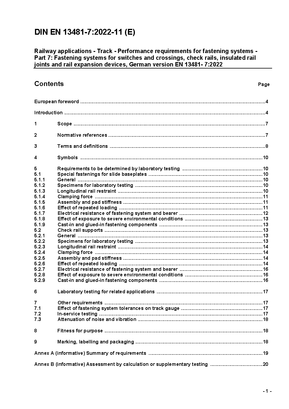 This European Standard specifies performance requirements for special fastening systems for switches and crossings and check rails secured within the overall fastening system (not independently fixed to the bearers) on wood, concrete and steel bearers in ballasted track and on slab track in categories A - E (EN 13481-1, clause 3.1) which have maximum axle loads and minimum curve radii in divergent track in accordance with table 1.Table 1 - Track category criteriaCategory Maximum axle load kN Minimum curve radius m A 130 40 B 180 80 C 260 150 D 260 400 E 350 150NOTE The maximum axle load for categories A and B does not apply to maintenance vehiclesThe requirements apply to fastening systems which incorporate a resilient element and act on the foot and/or web of the rail and are intended for use with stock rail sections in EN 13674-1.This standard is not applicable to rigid fastening systems.This standard is for type approval of a complete fastening assembly only. Requirements for quality control are included in standards applicable to individual components.