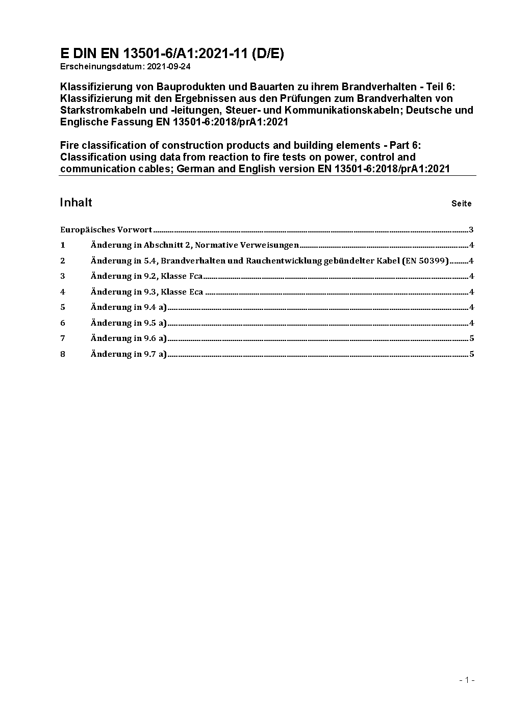 Fire classification of construction products and building elements - Part 6: Classification using data from reaction to fire tests on electric cables; German and English version prEN 13501-6:2017