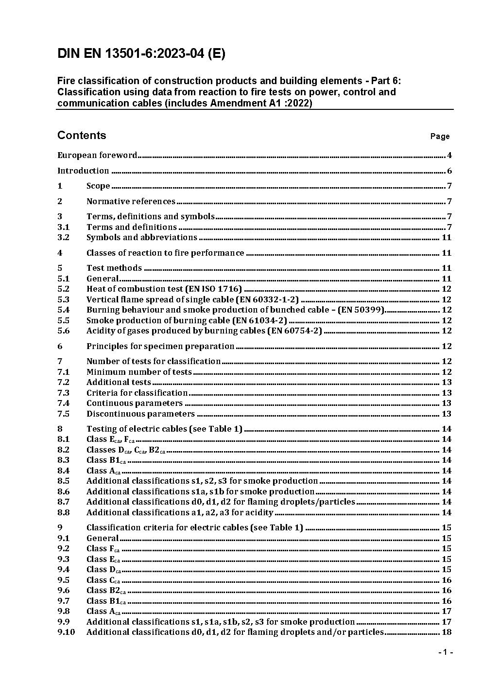 This European Standard provides the reaction to fire classification procedure for electric cables. For the purpose of this European Standard the term 'electric cables' covers all power, control and communication cables, including optical fibre cables.