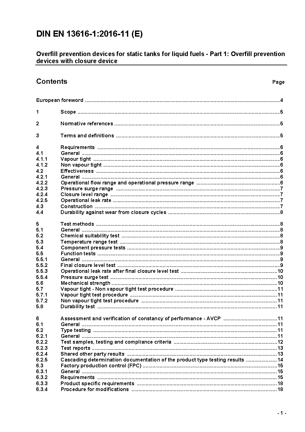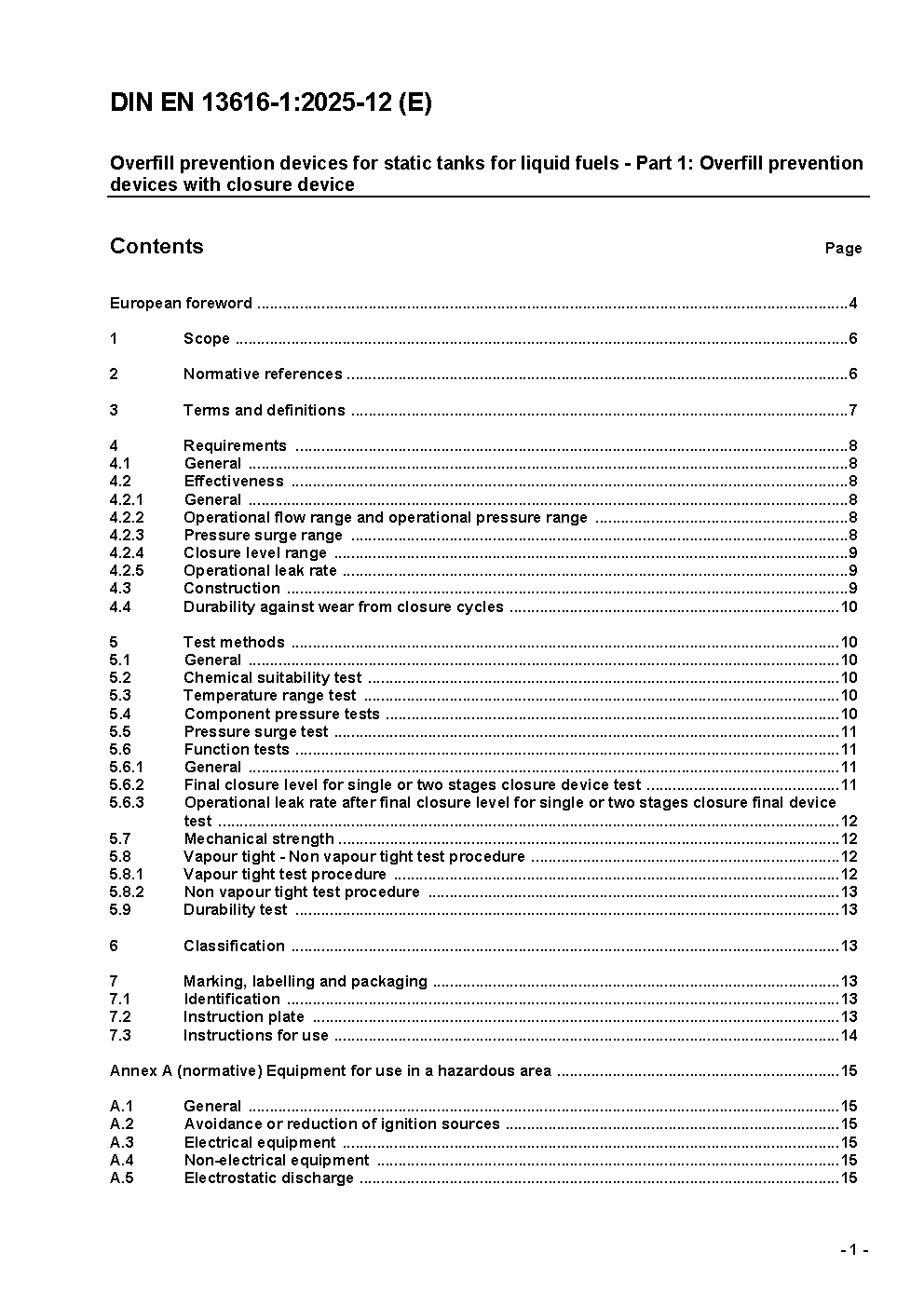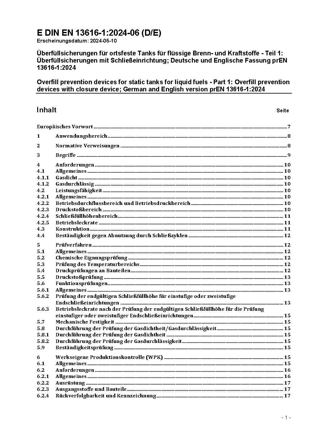 Überfüllsicherungen für ortsfeste Tanks für flüssige Brenn- und Kraftstoffe - Teil 1: Überfüllsicherungen mit Schließeinrichtung; Deutsche und Englische Fassung prEN 13616-1:2024