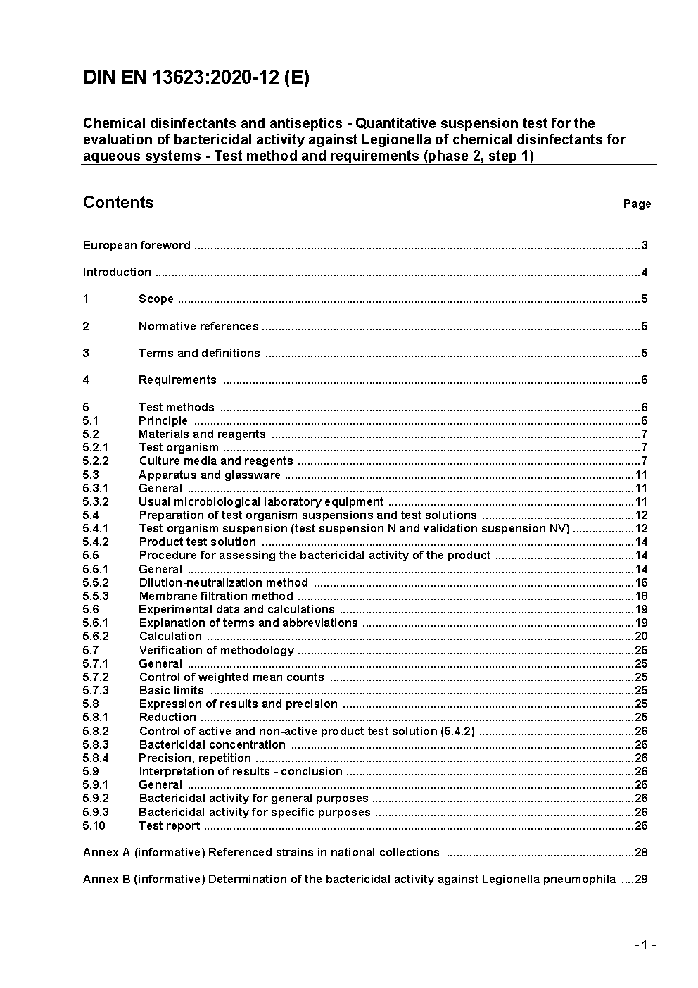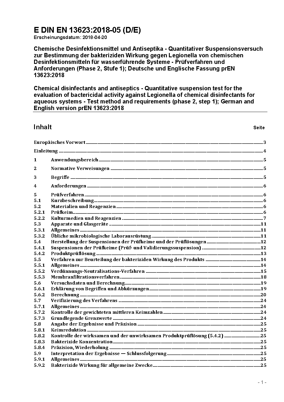 Chemische Desinfektionsmittel und Antiseptika - Bakterizide Wirkung von Produkten gegen Legionella pneumophila - Prüfverfahren und Anforderungen (Phase 2/Stufe 1); Deutsche Fassung prEN 13623:1999