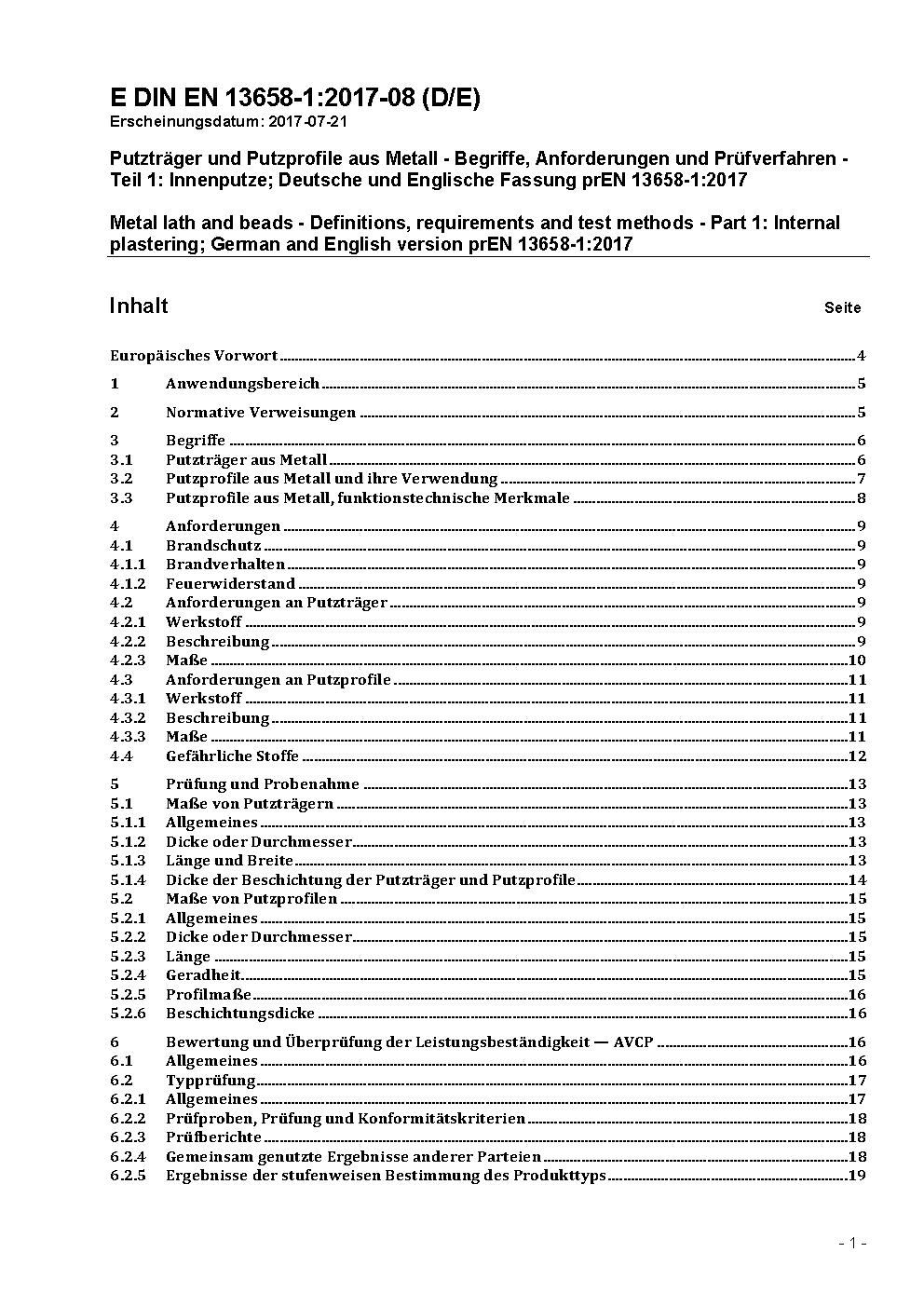 Metal lath and beads - Definitions, requirements and test methods - Part 1: Internal plastering; German version EN 13658-1:2005